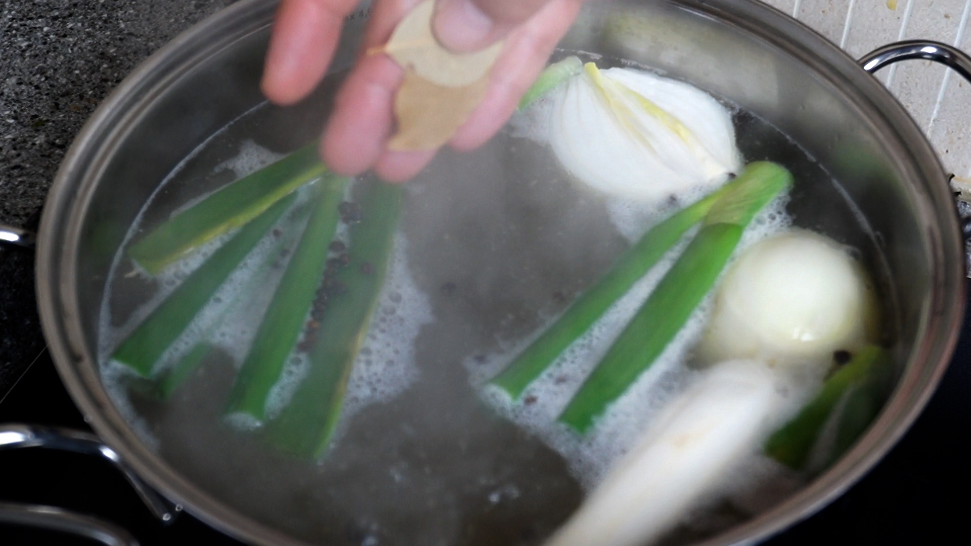 5. 월계수잎을 3장 넣어주세요. 고기 삶을때 마늘,미림,소주,커피,녹차 등등 잡내 잡는 재료가 많이 있지만 냉동이나 좀 시간이 지난 냉장육엔 잡내잡는 재료가 많이 필요하지만 신선한 냉장육은 이정도만 넣어도 충분합니다.