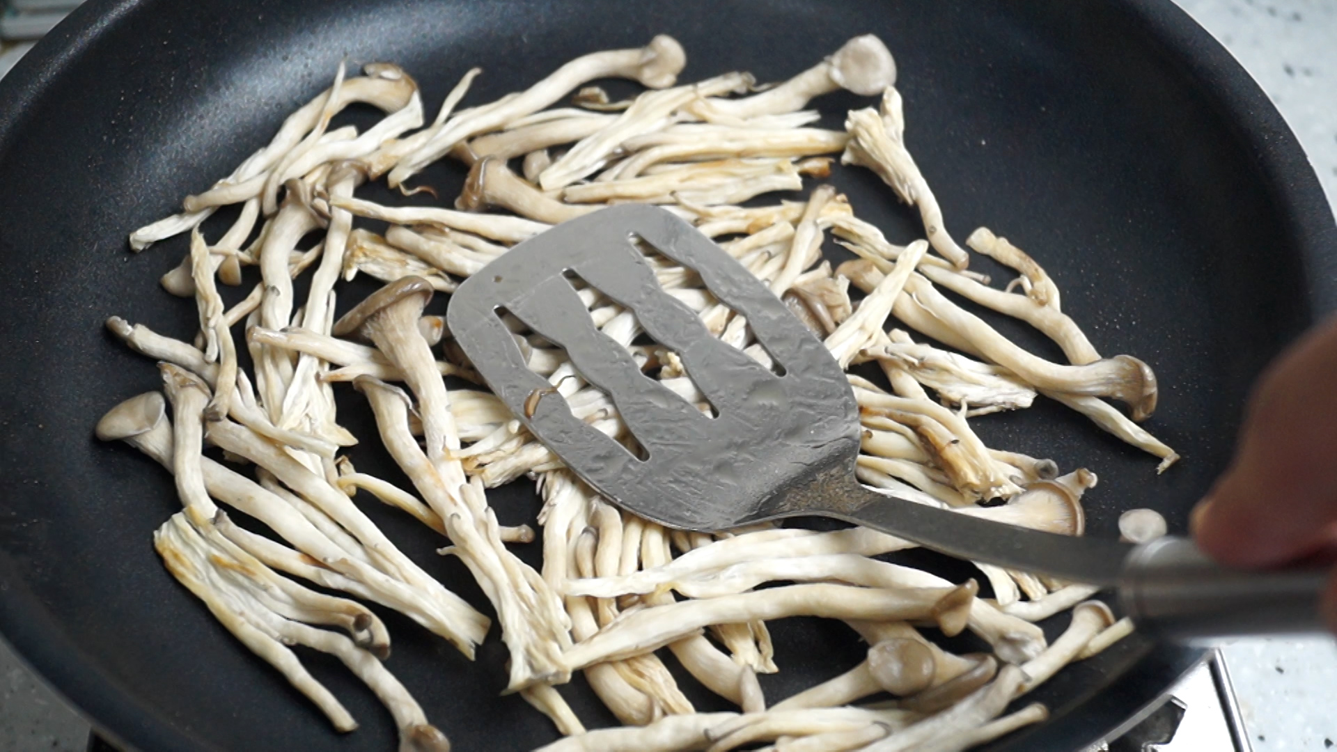 16. 강불로 달굴 팬에 버섯을 최대한 겹치지 않게 올리고 꾹꾹 눌러가면서 버섯을 구워주세요. 강불에 빠르게 익은 버섯은 수분을 최대한 잡고 있고 빠져나오는 수분은 바로바로 증발해서 버섯은 쫀득해지고 볶았을때 버섯볶음이 물바다가 되지 않습니다. 10~20초에 한번 뒤집어 가면서 1~2분 정도 구워서 버섯이 살짜 노릇노릇 해 질때까지 구워 주세요.