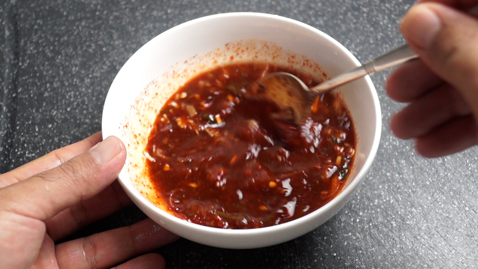 1. 양념란에 적힌 재료를 한데넣고 섞어주세요. 고춧가루는 반찬용에 사용되는 중간입자 고춧가루입니다.