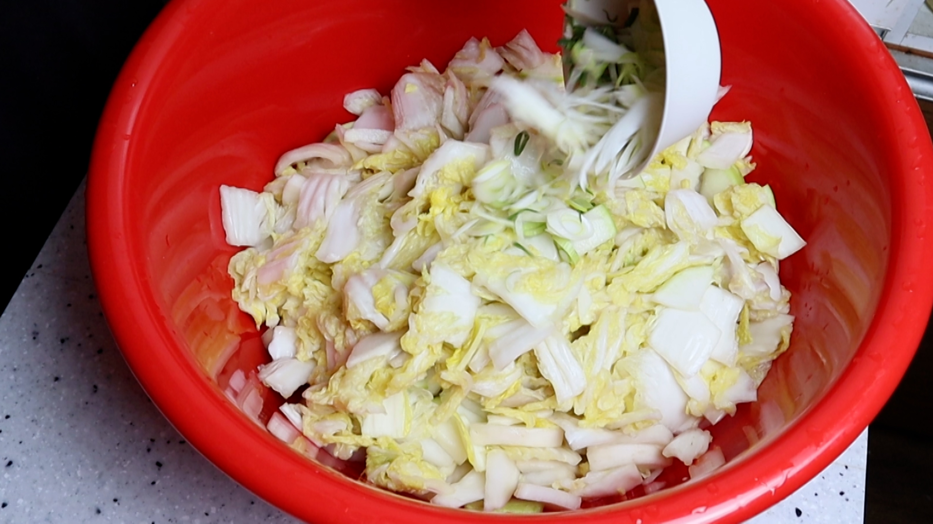 22. 볼에 배추를 담고 쪽파 80g 을 잘라서 넣어주세요. 전...쪽파값이 비싸도 너무 비싸서 대파를 80g 채 썰어 넣었습니다.