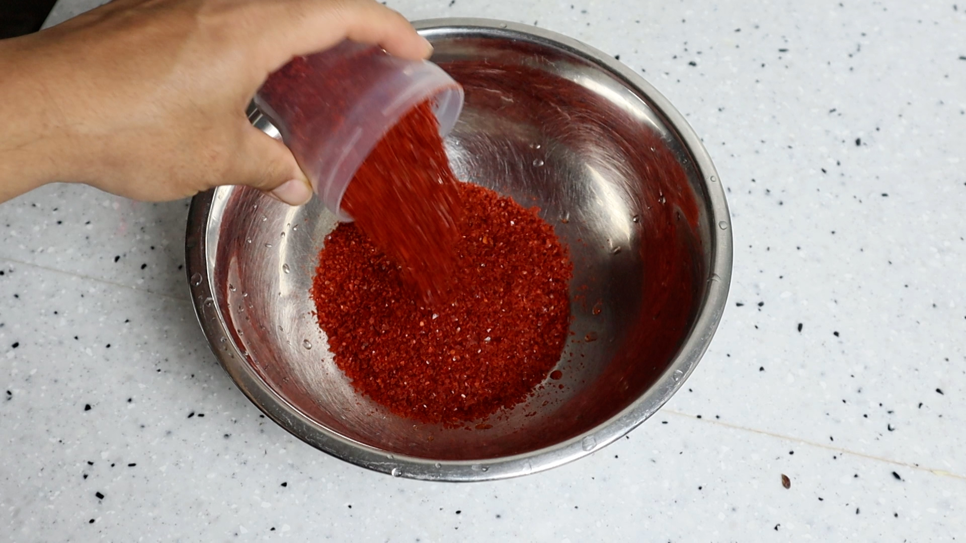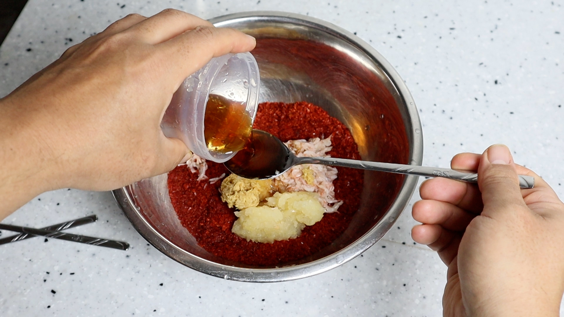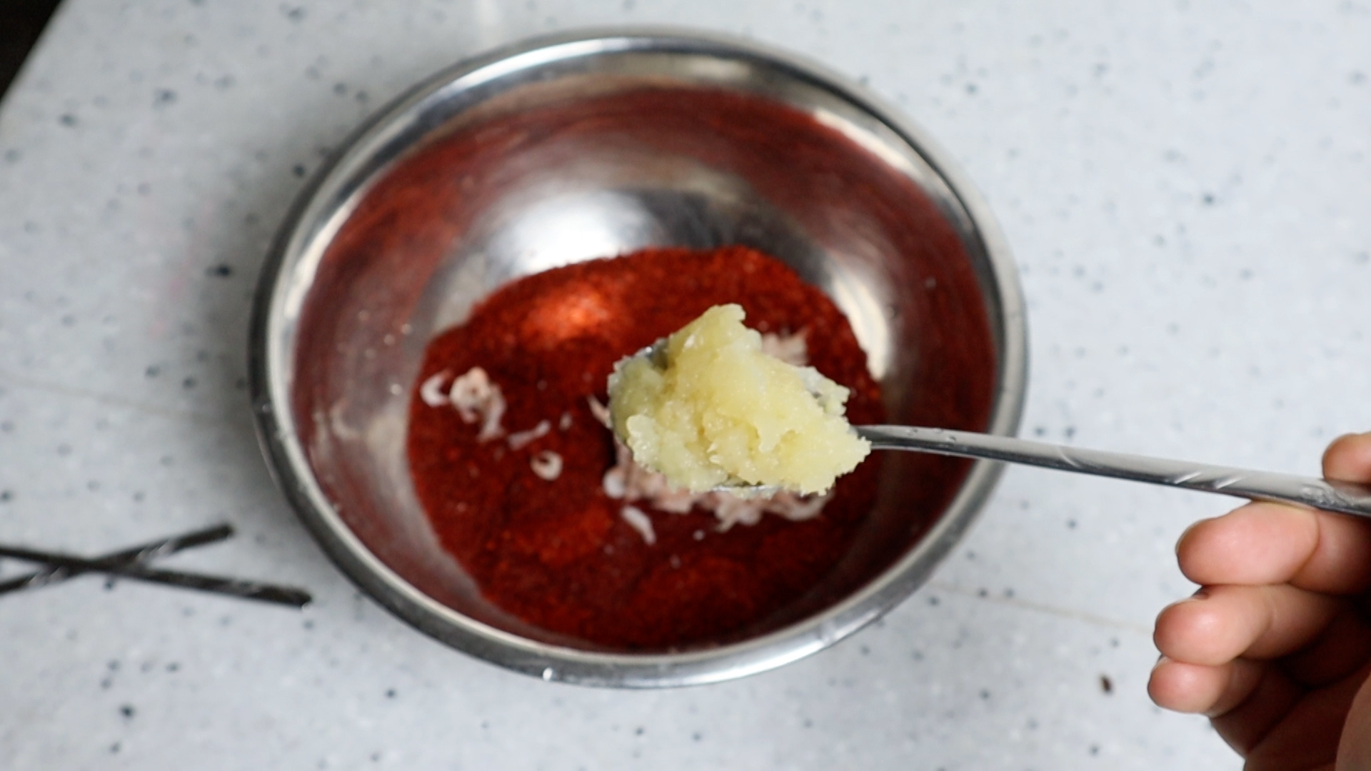 13. 멸치액젓을 넣어주세요. 고춧가루 부피의 대략 절반 정도 넣으시면 됩니다.