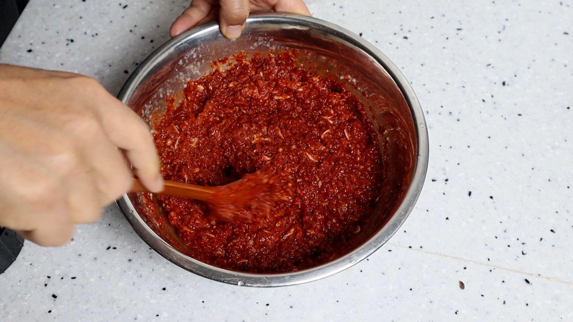 18. 갈아놓은 재료를 우선 90% 만 넣고 골고루 섞어주세요. 남은 10%는 양념이 너무 뻑뻑하거나 짠맛이 강할때 추가해주세요.