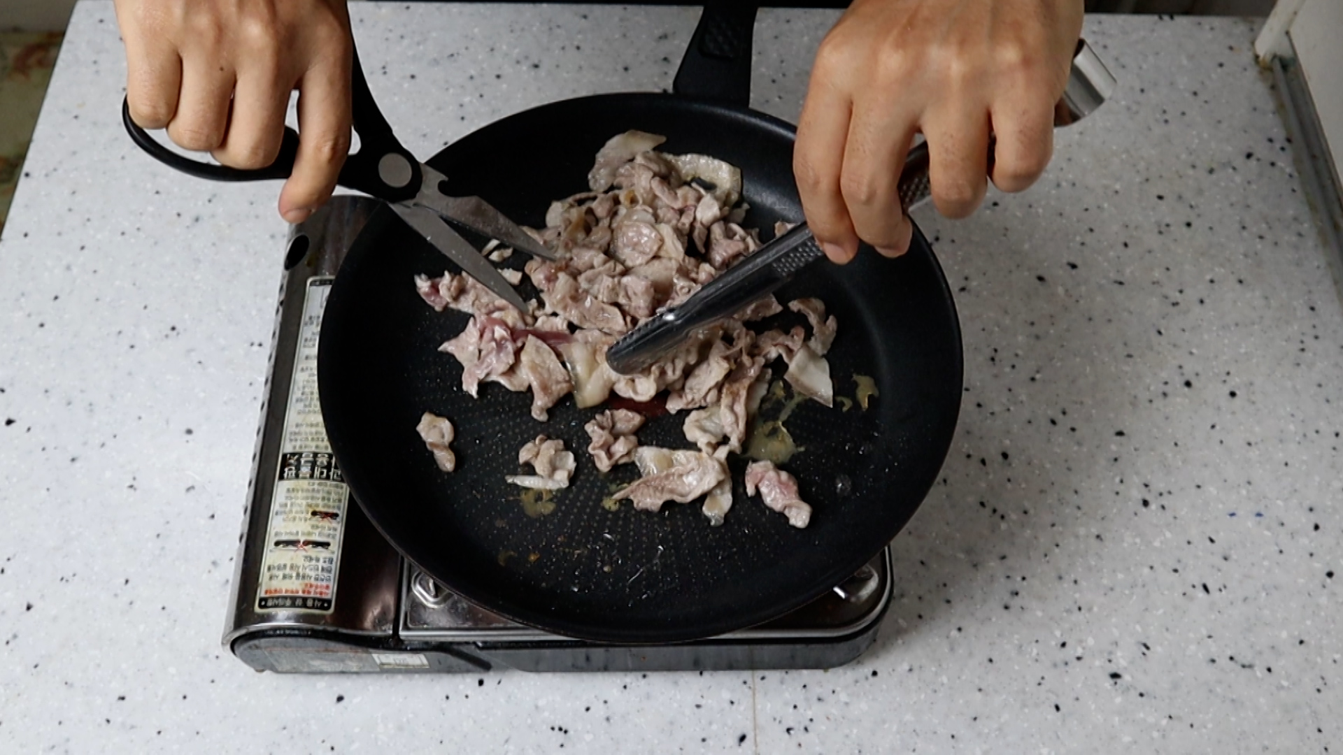 13. 팬을 최대한 넓은 코팅팬을 준비해서 강불로 달군 다음 기름기가 적당한 앞다리살 삼겹살 등을 넣어서 완전히 익힌 다음 먹기 좋게 잘라주세요.