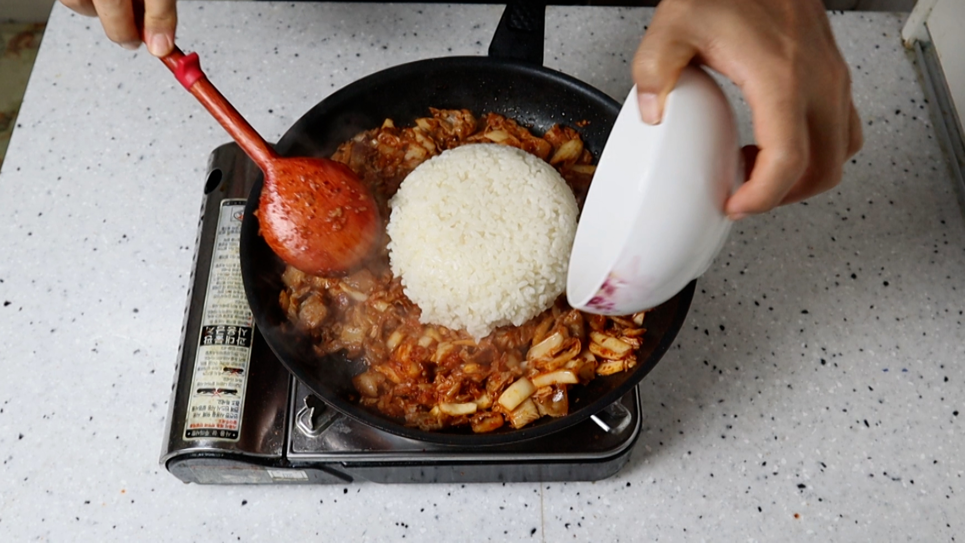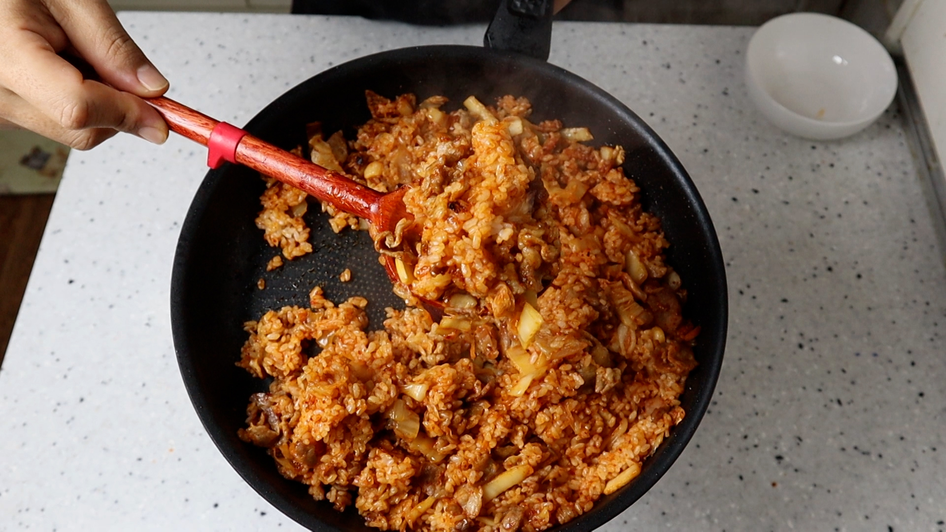 19. 강불에 1분간 골고루 섞으면서 볶아준 다음에 불을 중불로 줄이고 밥을 넓게 펼쳐서 20초간 가만히 두고 섞어주고 가만두고 섞어주고를 2~3차례 반복해서 양념과 밥알이 최대한 많이 눌어 붙게 만들어주세요.
