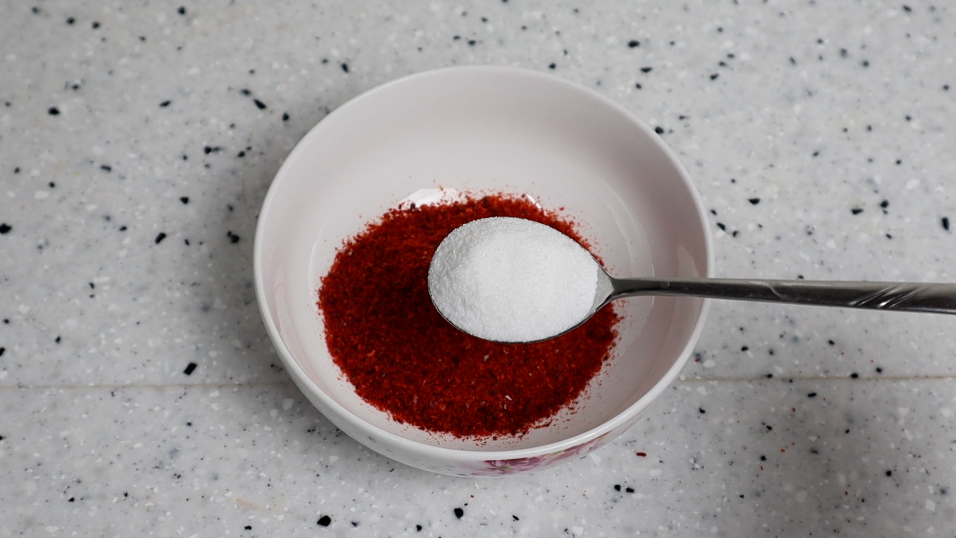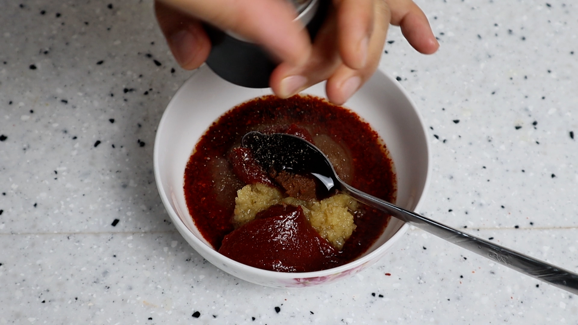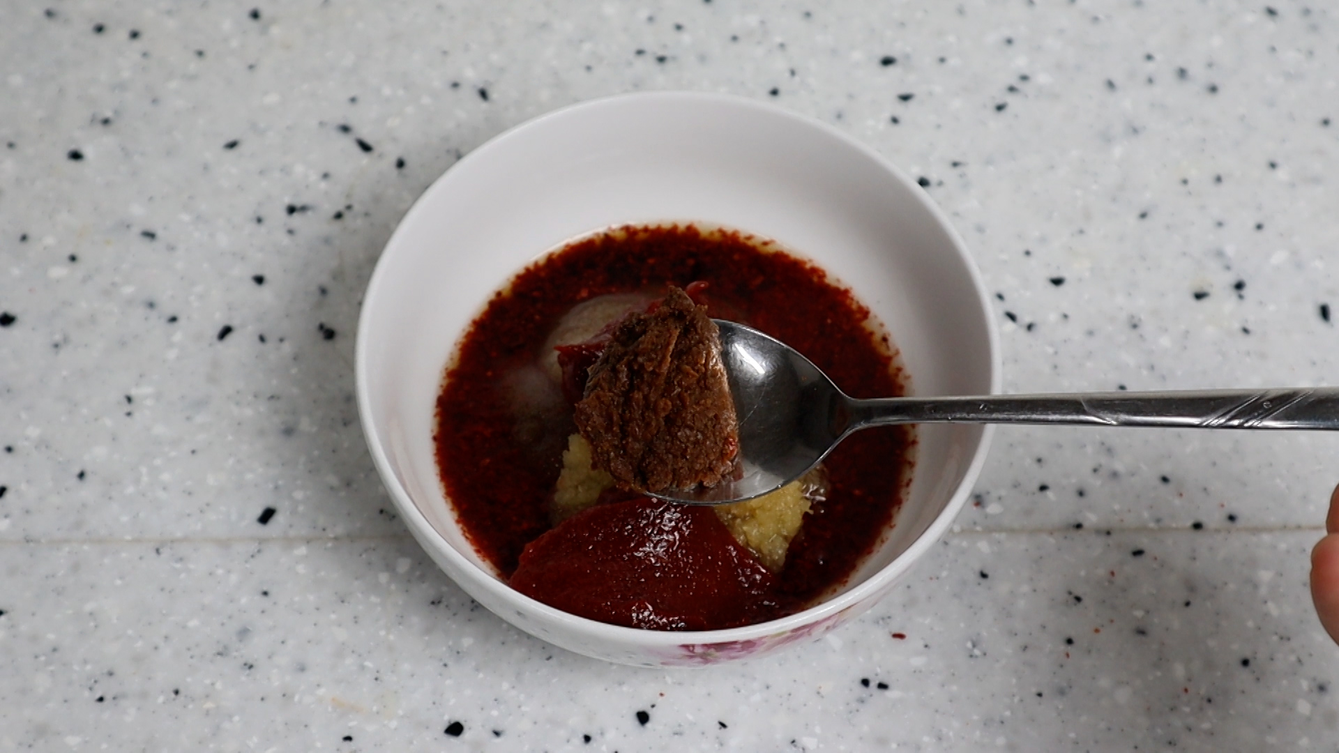 1. 양념란에 적힌 재료를 한데 넣고 골고루 섞어주세요. 고춧가루는 중간입자 고춧가루입니다. 매운맛을 올리려면 땡초가루를 절반씩 섞어보세요.