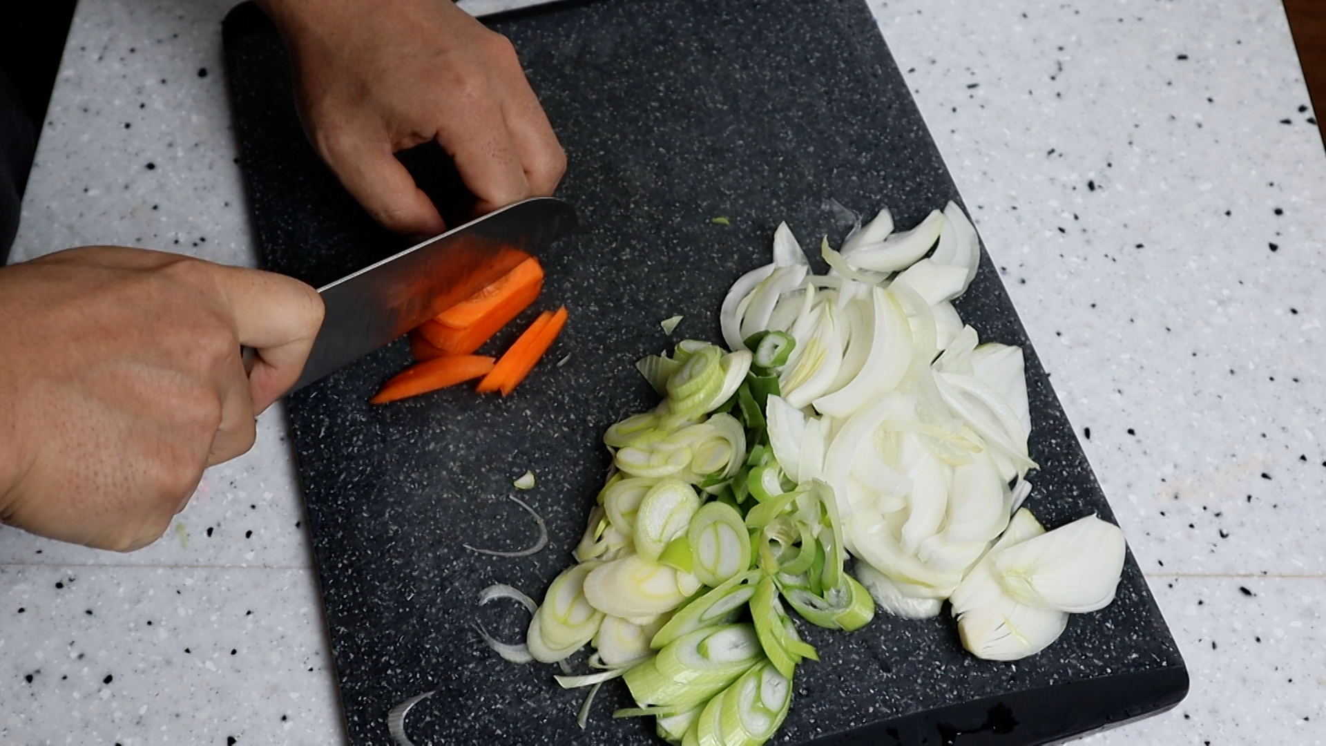 13. 당근은 3~4mm 두께로 썰고 크기는 기호에 따라 썰어주세요.
