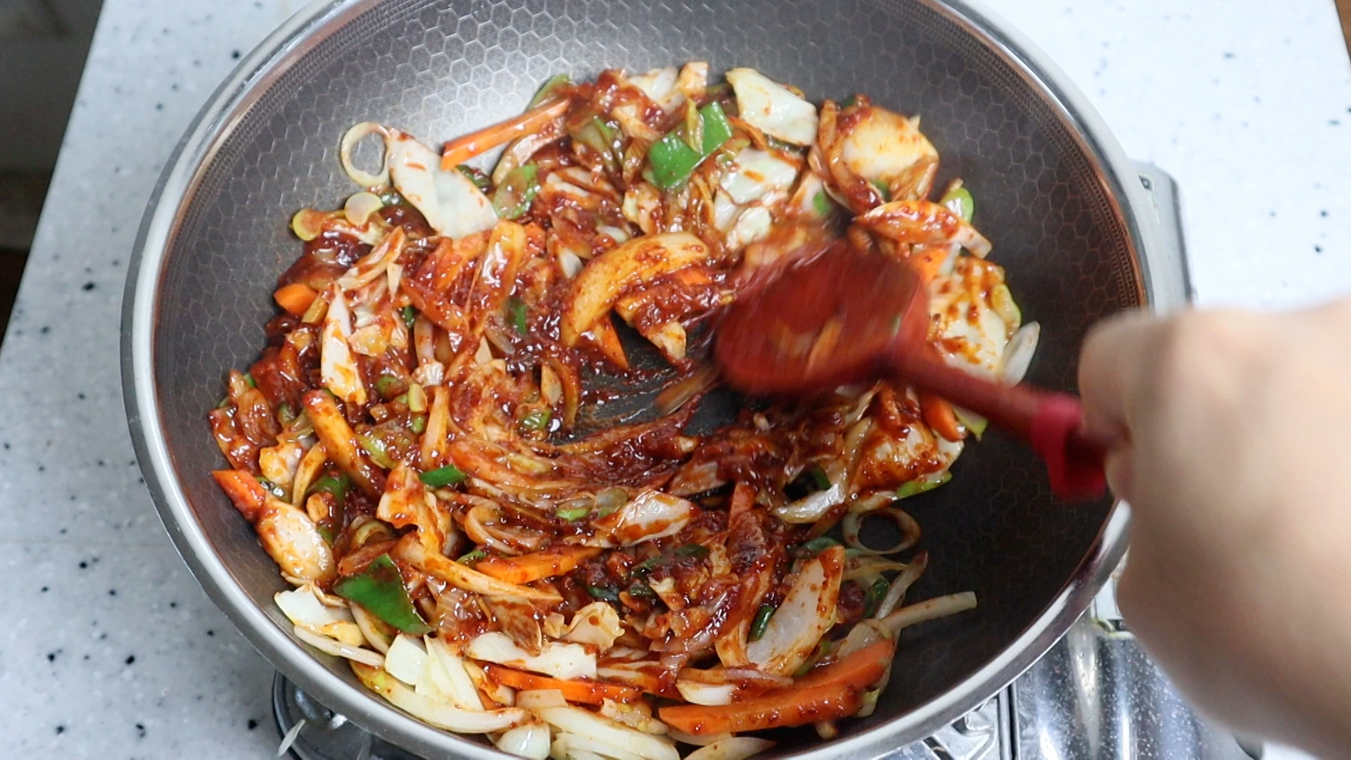 6. 고추장을 넣어주세요. 시판고추장엔 일정양의 MSG 가 포함되어 있어 집 고추장보다 볶음 했을때 더 맛있답니다.