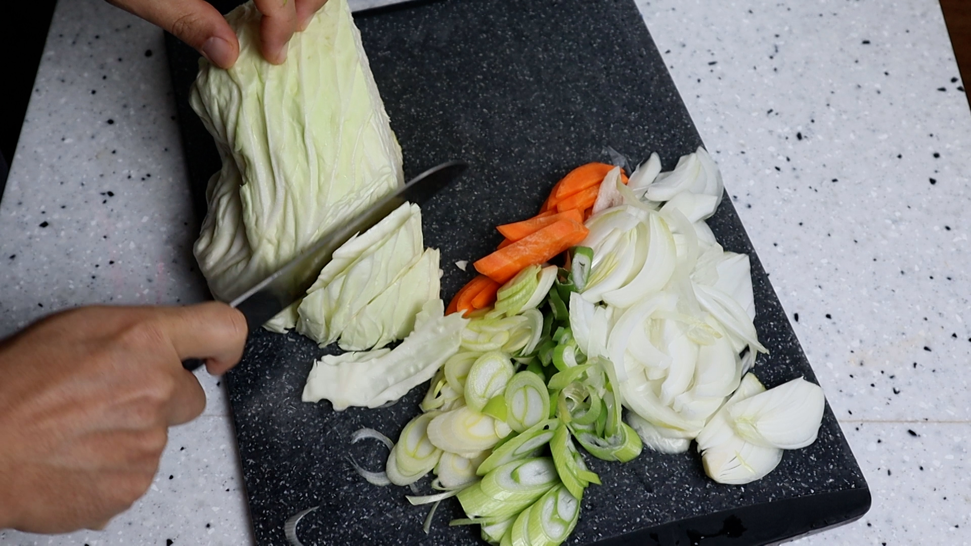 14. 양배추는 2~3cm 폭으로 썰어고 크기는 기호에 따라 썰어주세요.