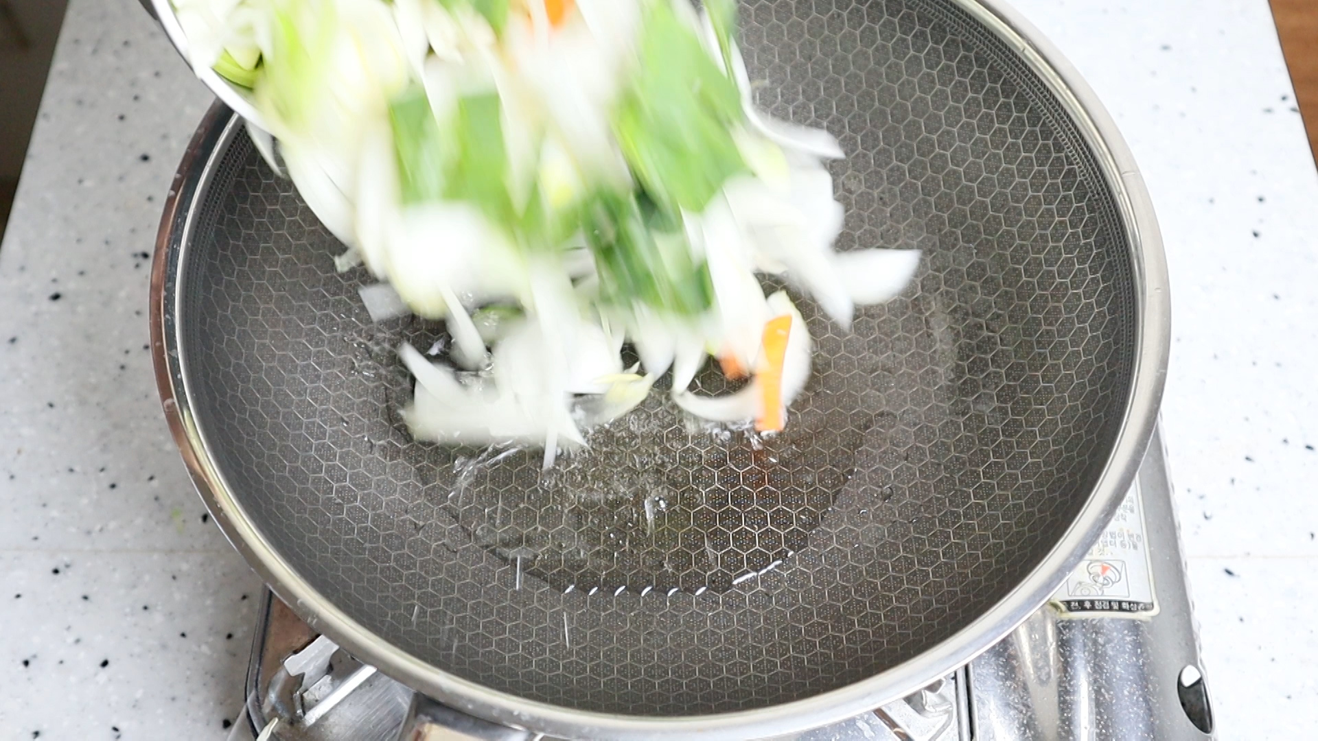 16. 코팅팬에 식용유 4스푼 20g을 강불로 달궈서 야채를 전부 넣어주세요.