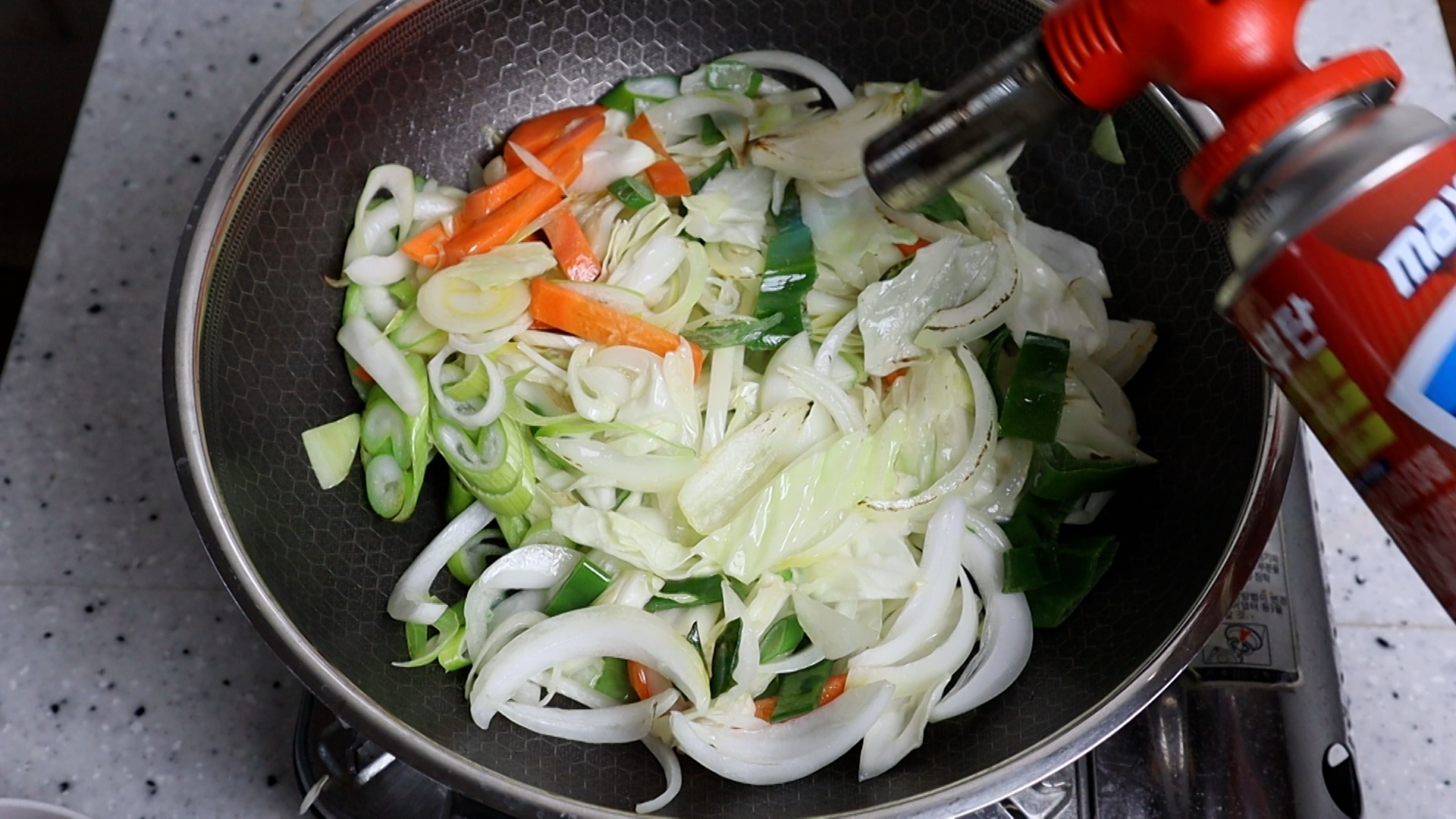 18. 토치질이 가능하시면 야채에 토치질을 좀 해주시면 좀더 맛있습니다. 물론~ 토치질 안하고 강불에 계속 볶으면 진짜 맛있으니 토치 없다고 걱정마세요!