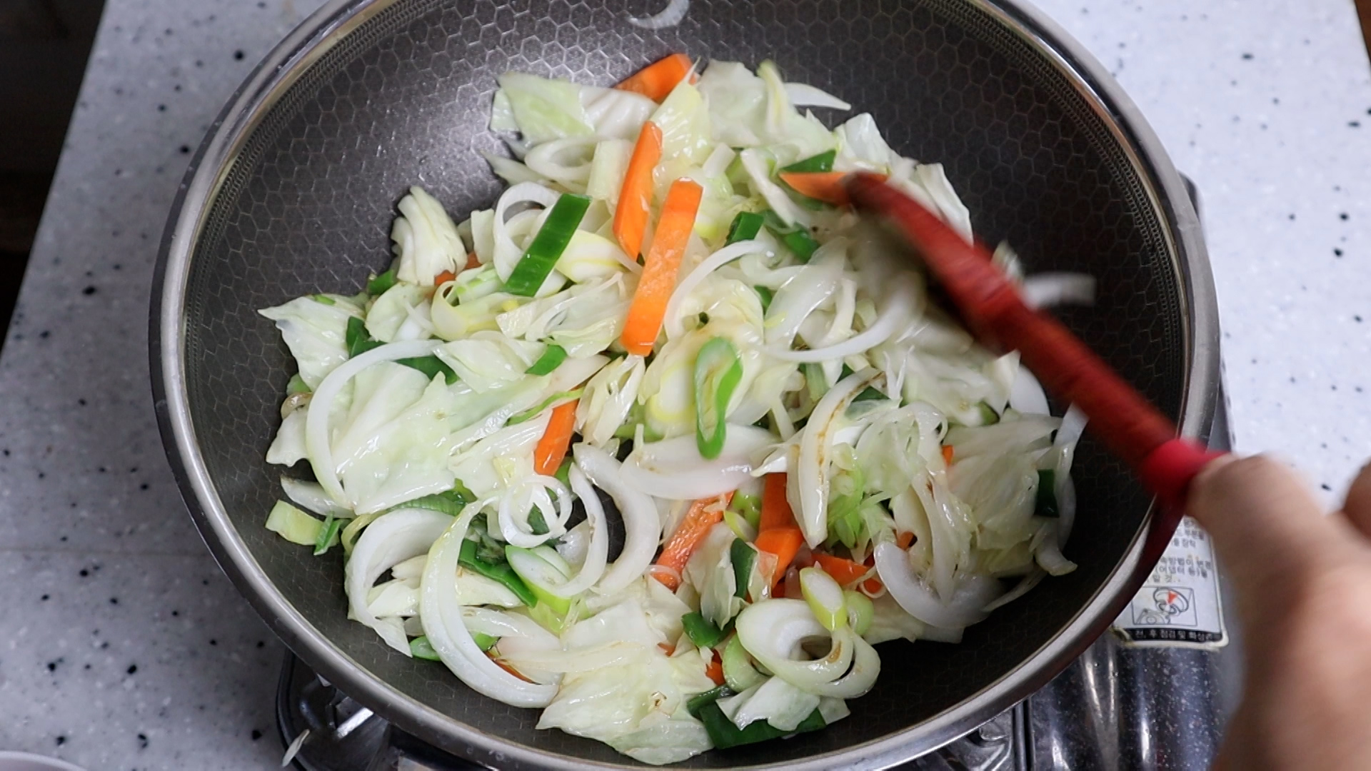 17. 골고루 섞으면서 야채를 아삭하고 수분 없게 2~3분 볶아주세요.