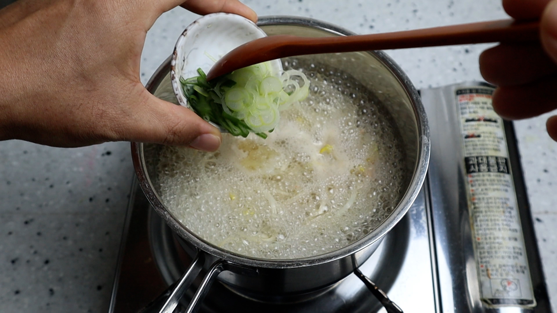 9. 물이 끓으면 씻은 콩나물 크게 1주먹 100g 넣어주세요.