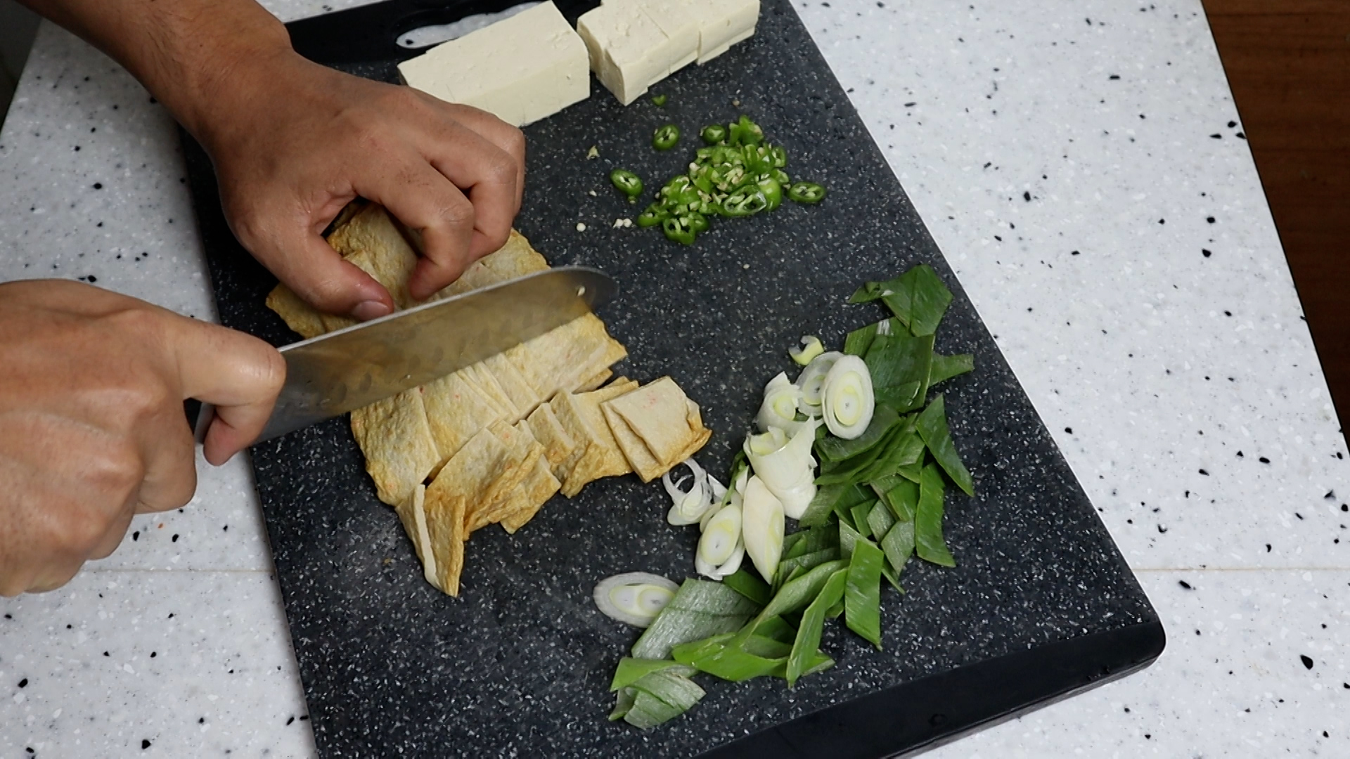 4. 사각어묵을 먹기 좋은 크기로 썰어주세요. 기호에 따라 다른 어묵을 준비하셔도 됩니다.