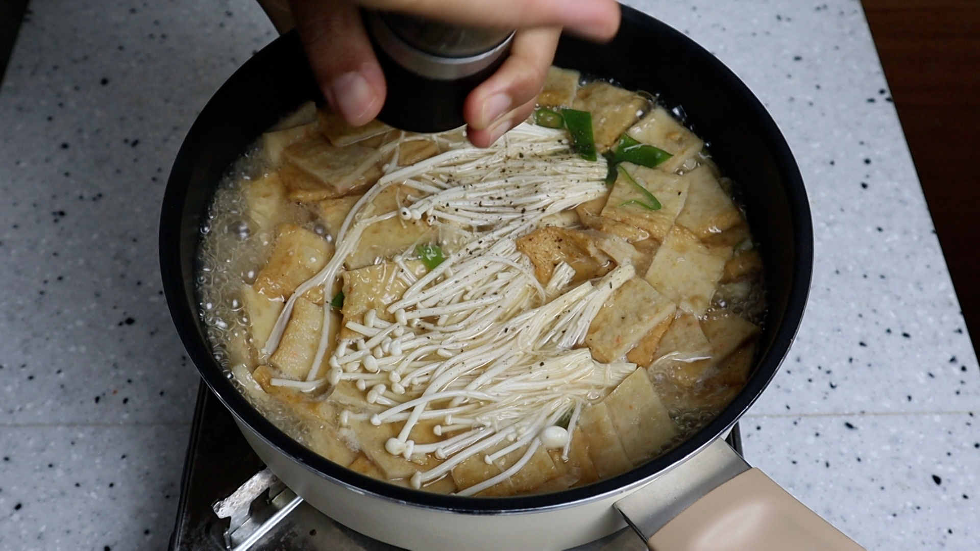 17. 후추가루를 뿌려 준 다음에 1분 정도만 더 끓여주세요.