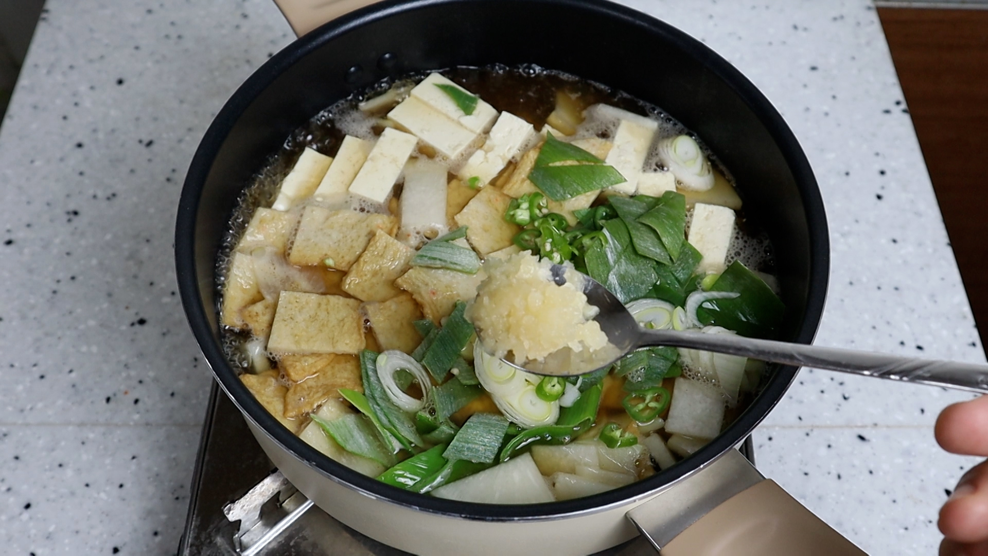 14. 두부 어묵 대파 땡초 전부 넣고 간마늘을 넣어주세요.