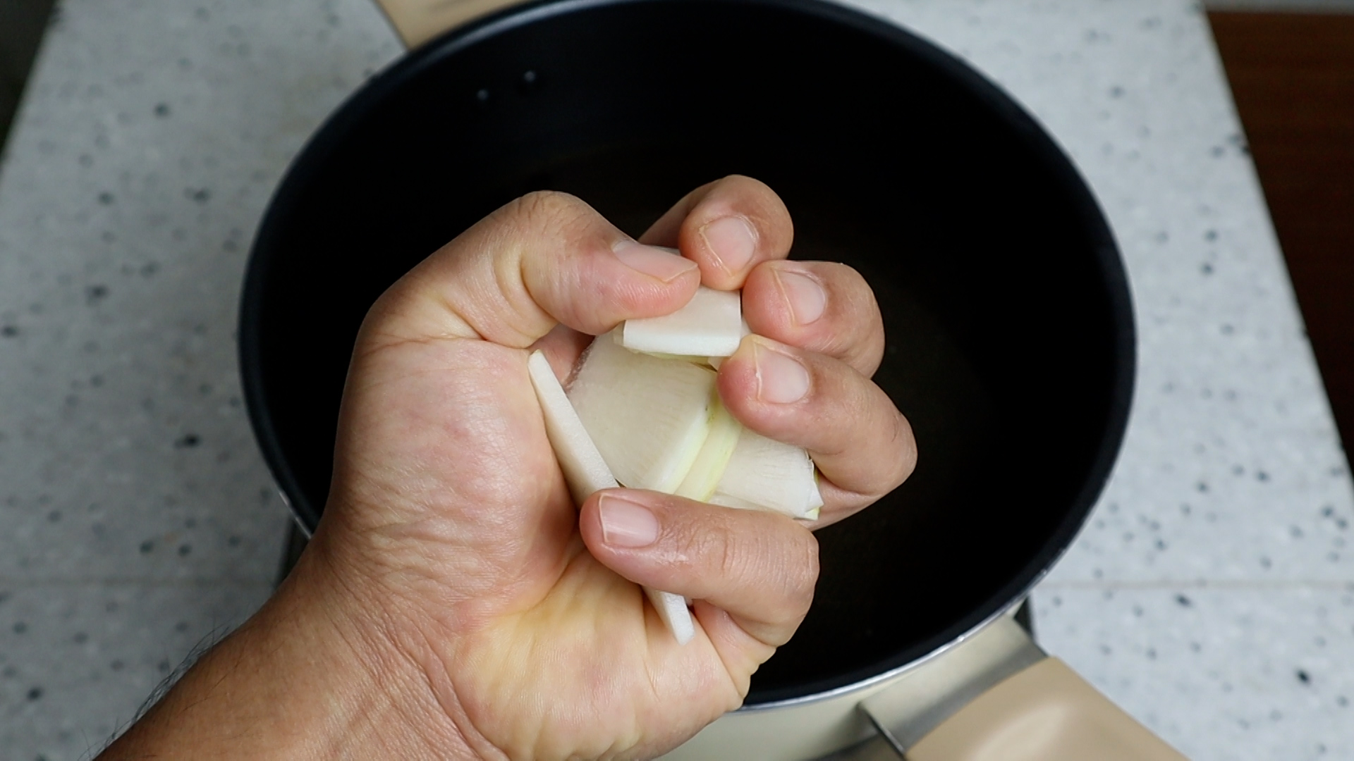 12. 무우는 2~3mm 로 얇게 썰어서 먹기 좋게 자르고 대략 2주먹 정도 넣어주세요.