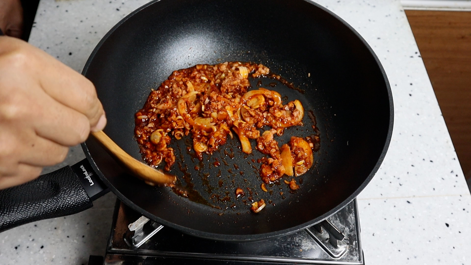 13. 약불에 자글거리기 시작하면 2분 정도 볶아주세요.