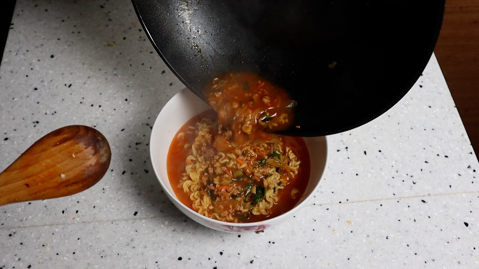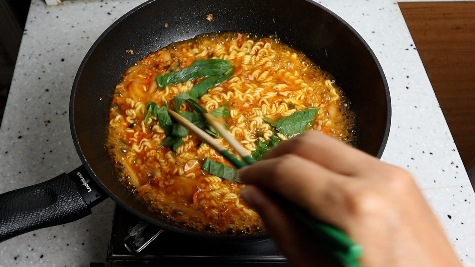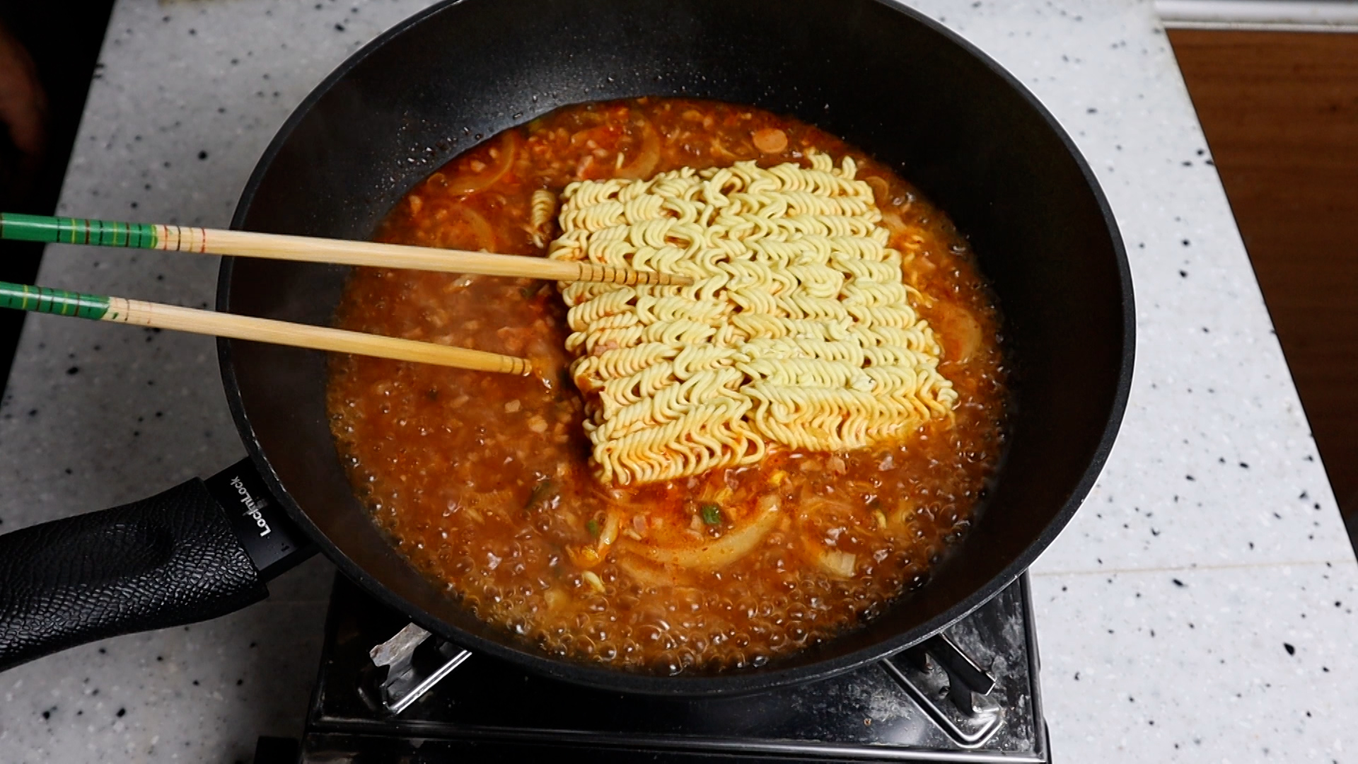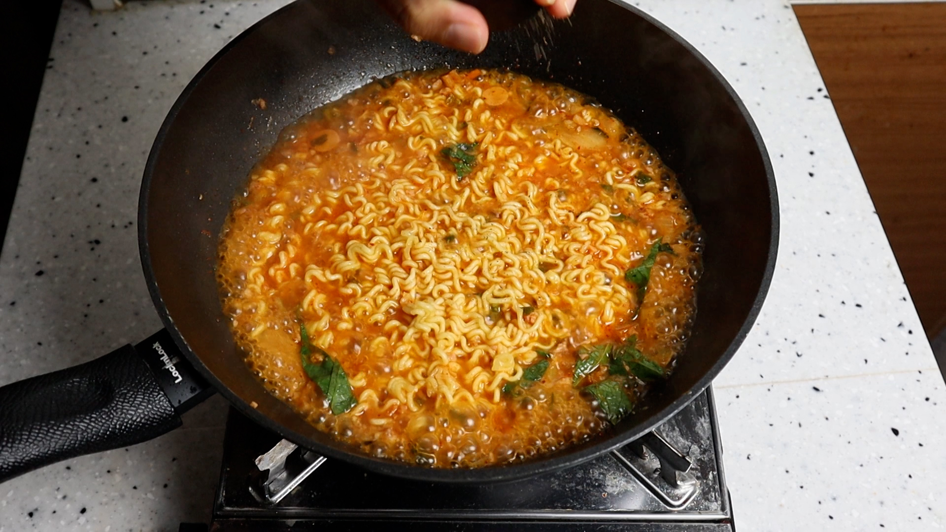 16. 라면을 골고루 섞으면서 4분간 끓여주세요.