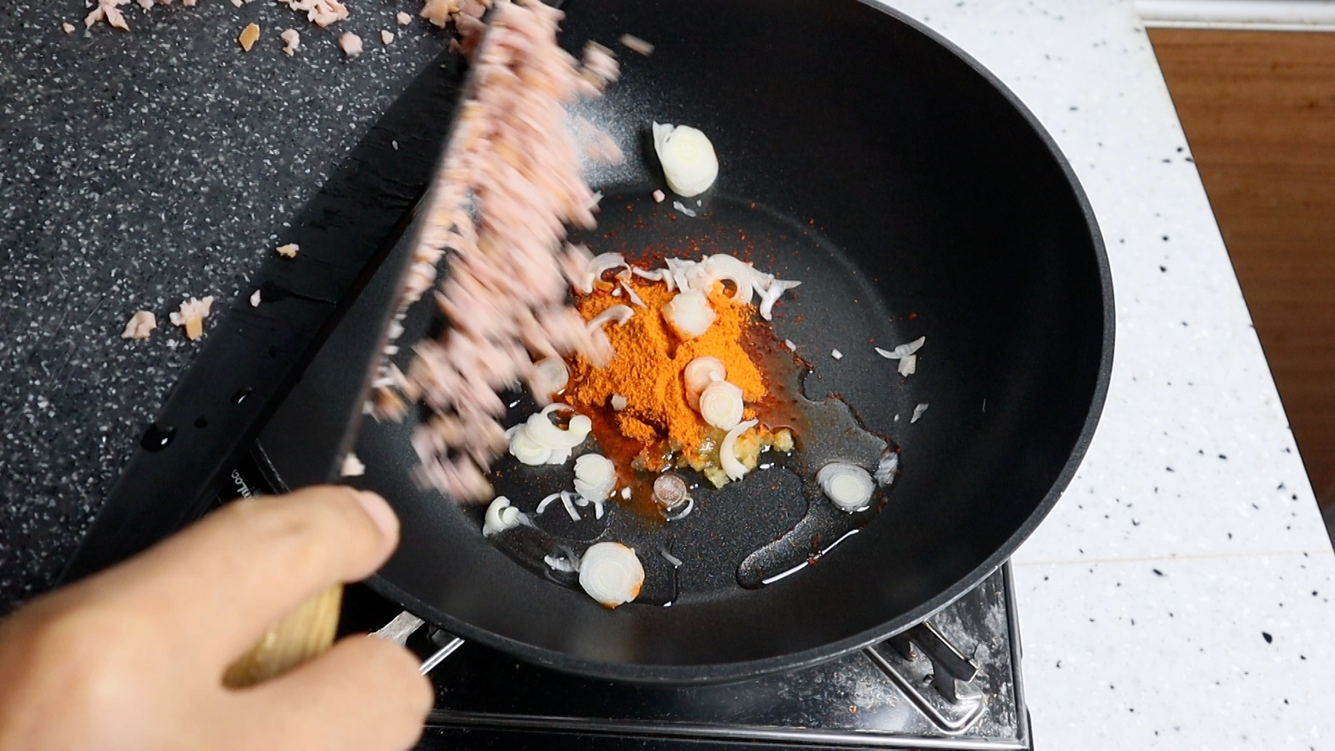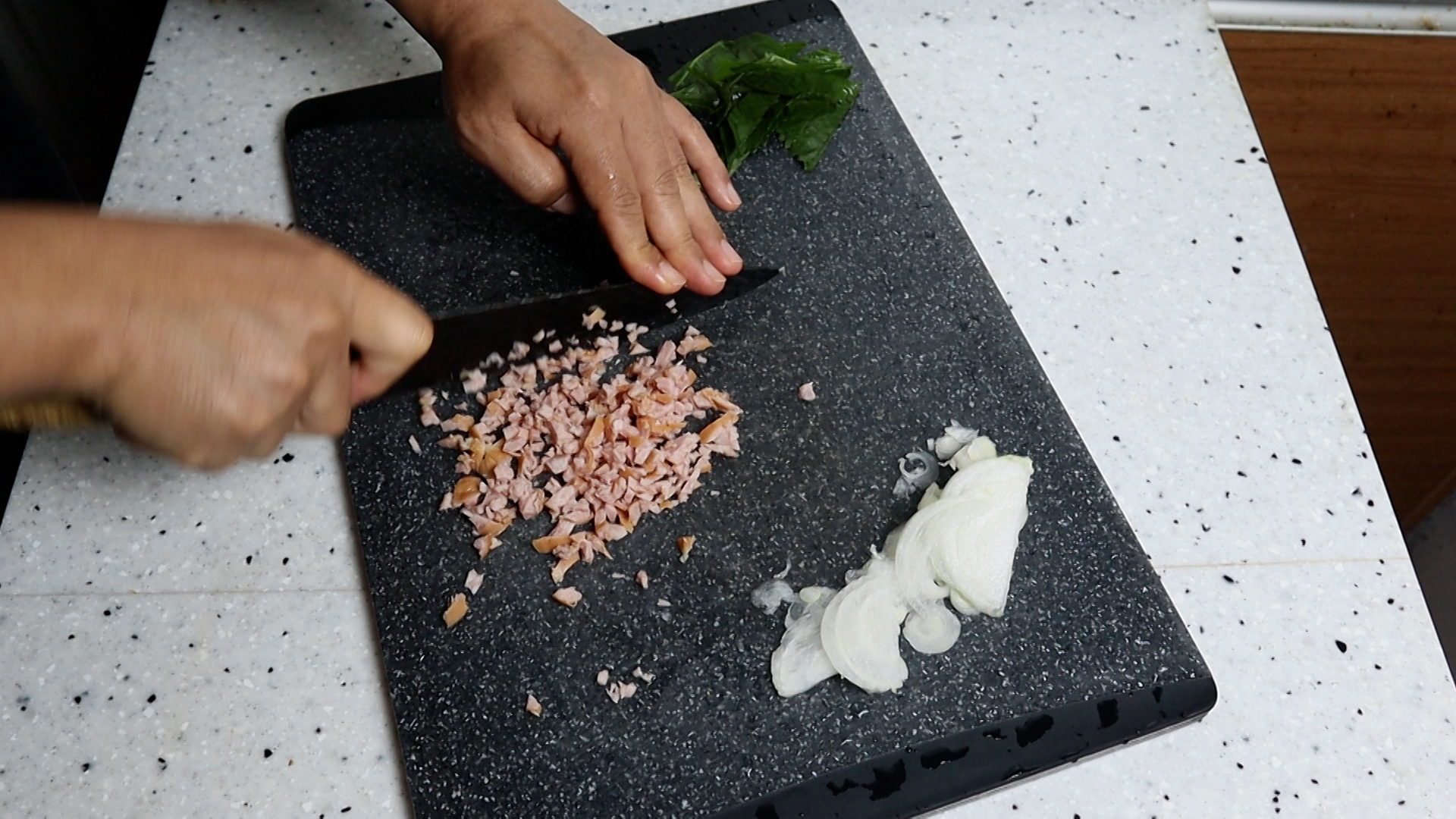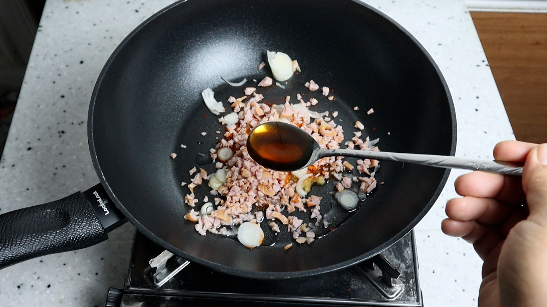 4. 햄은 가능하면 돈육함량이 90% 이상인걸로 잘게잘게 다져주세요.