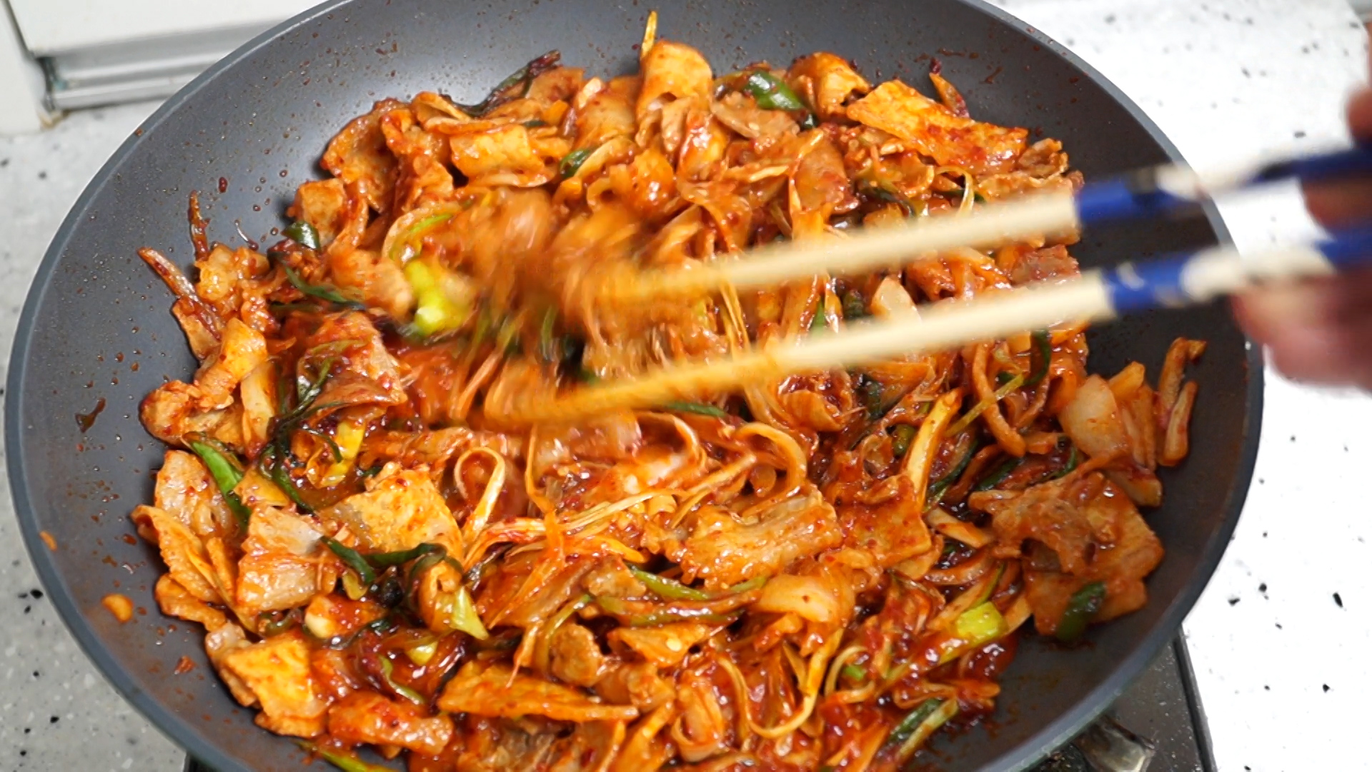 24. 김치와 고기를 1분간 강불에 볶아주세요.