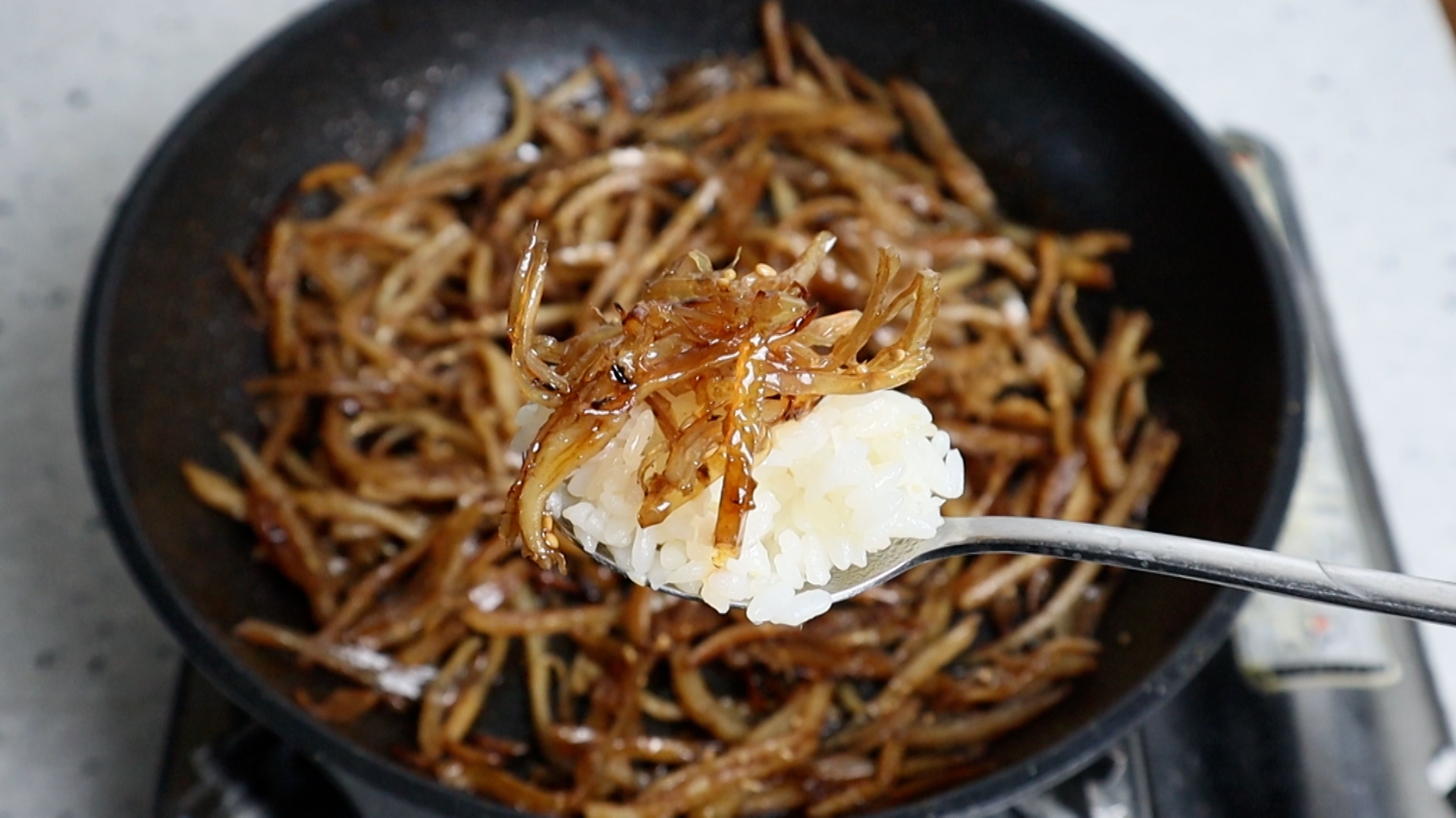 11. 진미채를 넣고 중불 유지하고 양념이 거의 다 꾸덕꾸덕 해질때까지 섞으면서 졸여주세요. 완성 직전 한개 먹어 보고 짠맛이 강할경우 물엿을 적당히 추가해보세요. 진미채 제조 업체마다 짠맛이 달라서 동일한 레시피를 써도 짠맛이 좀 다르게 나는 경우가 있더라고요.