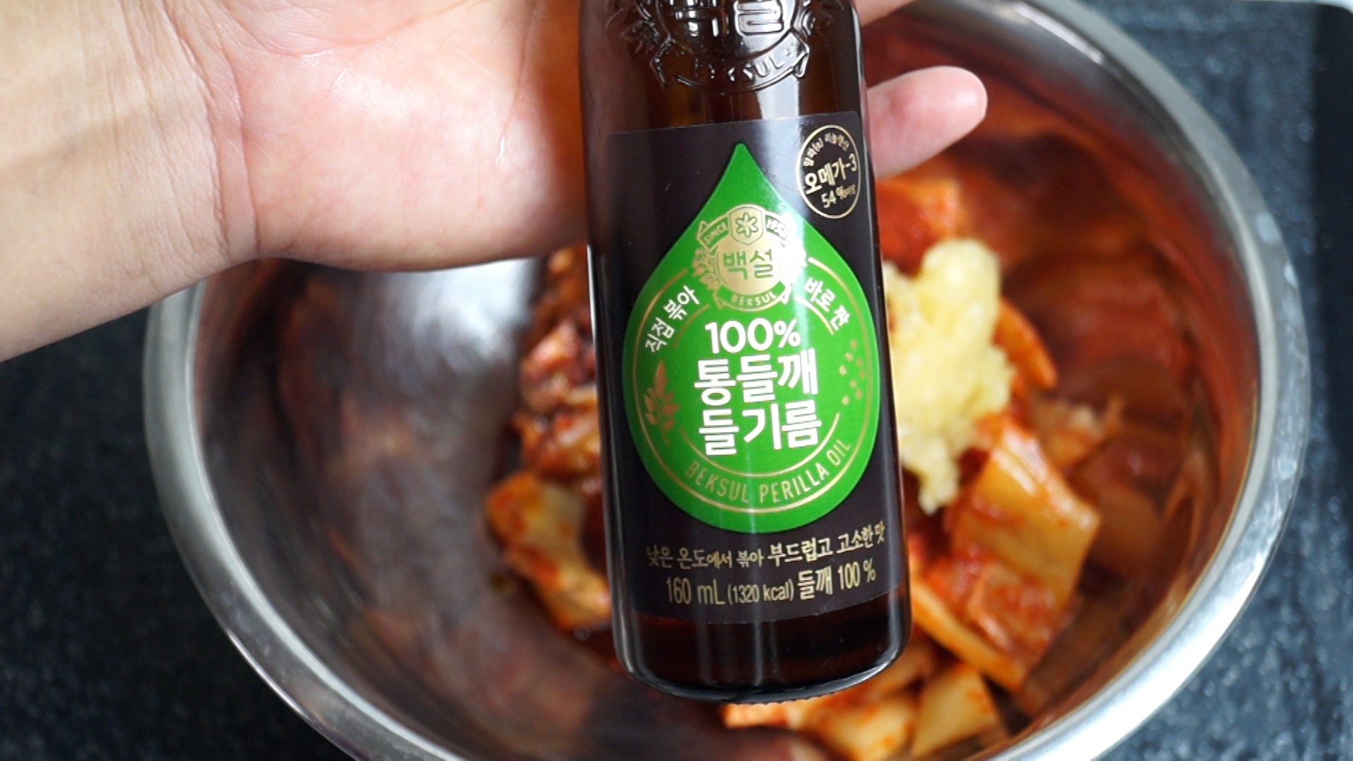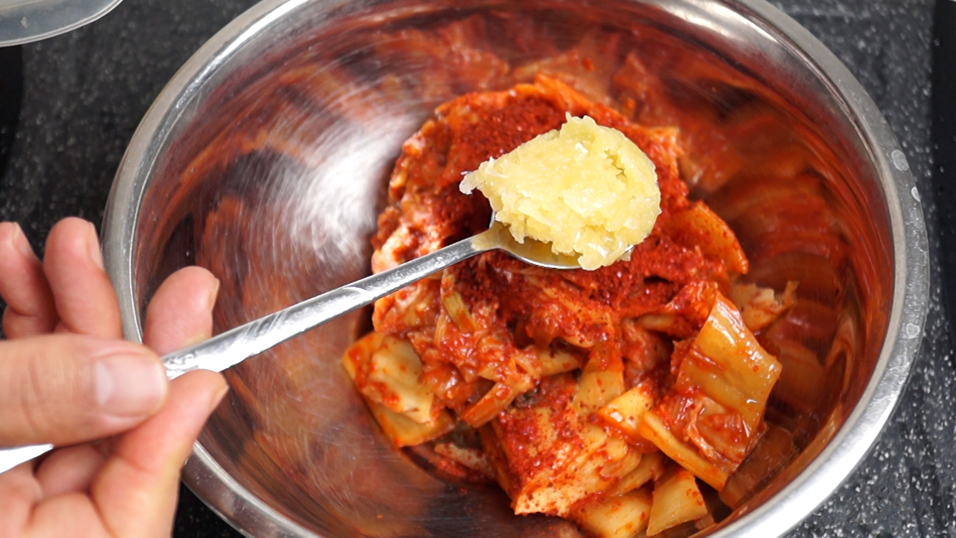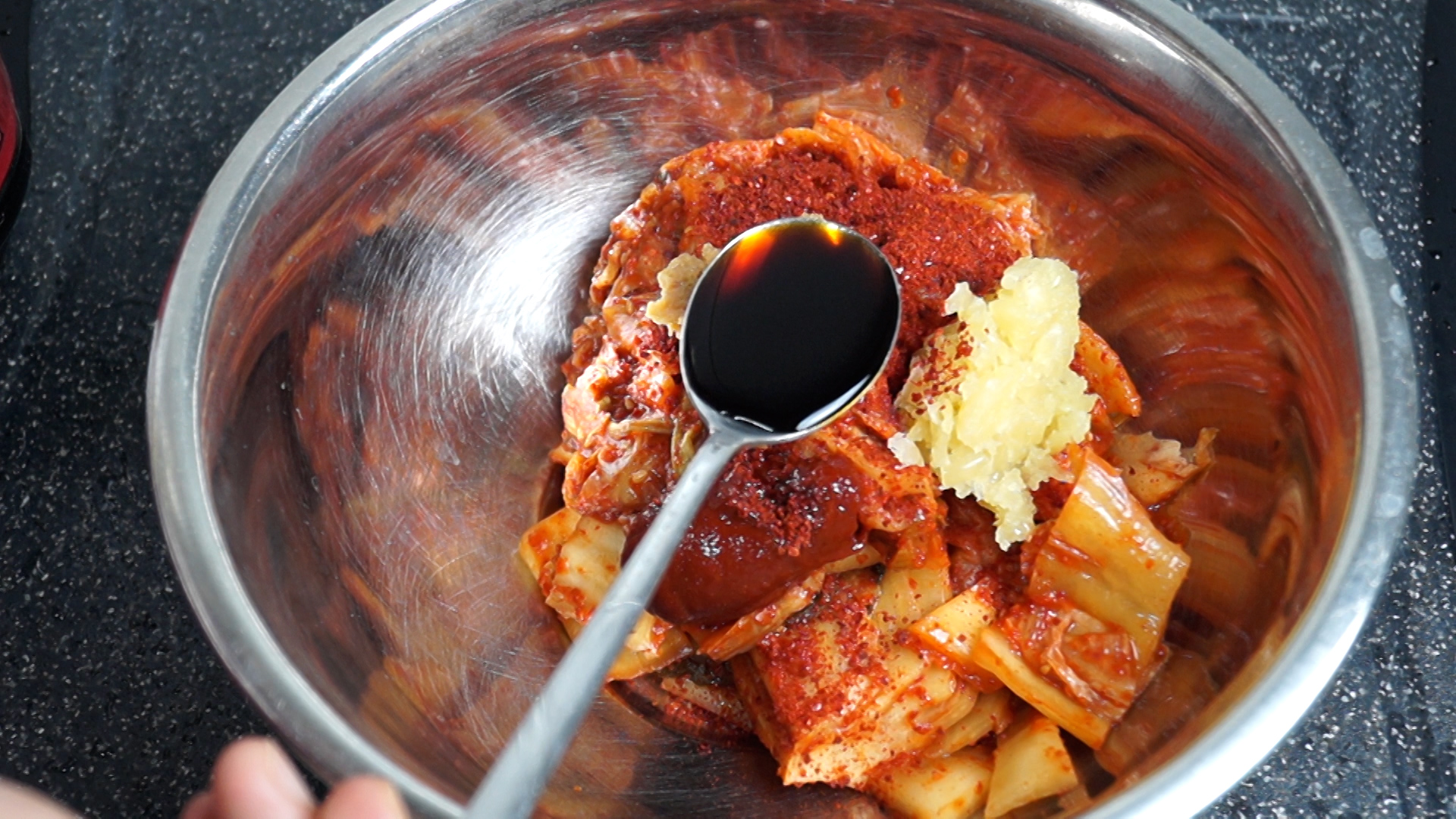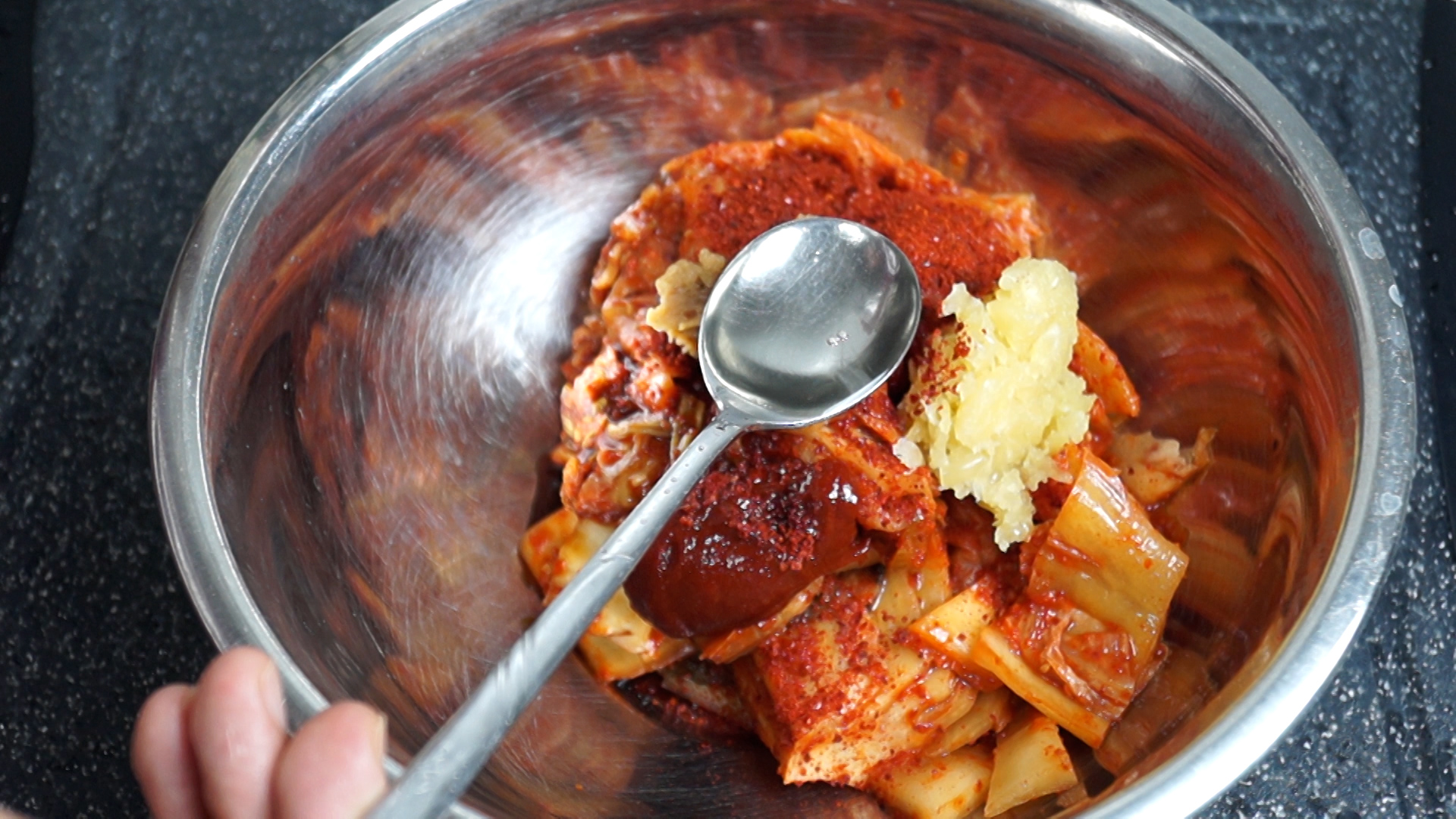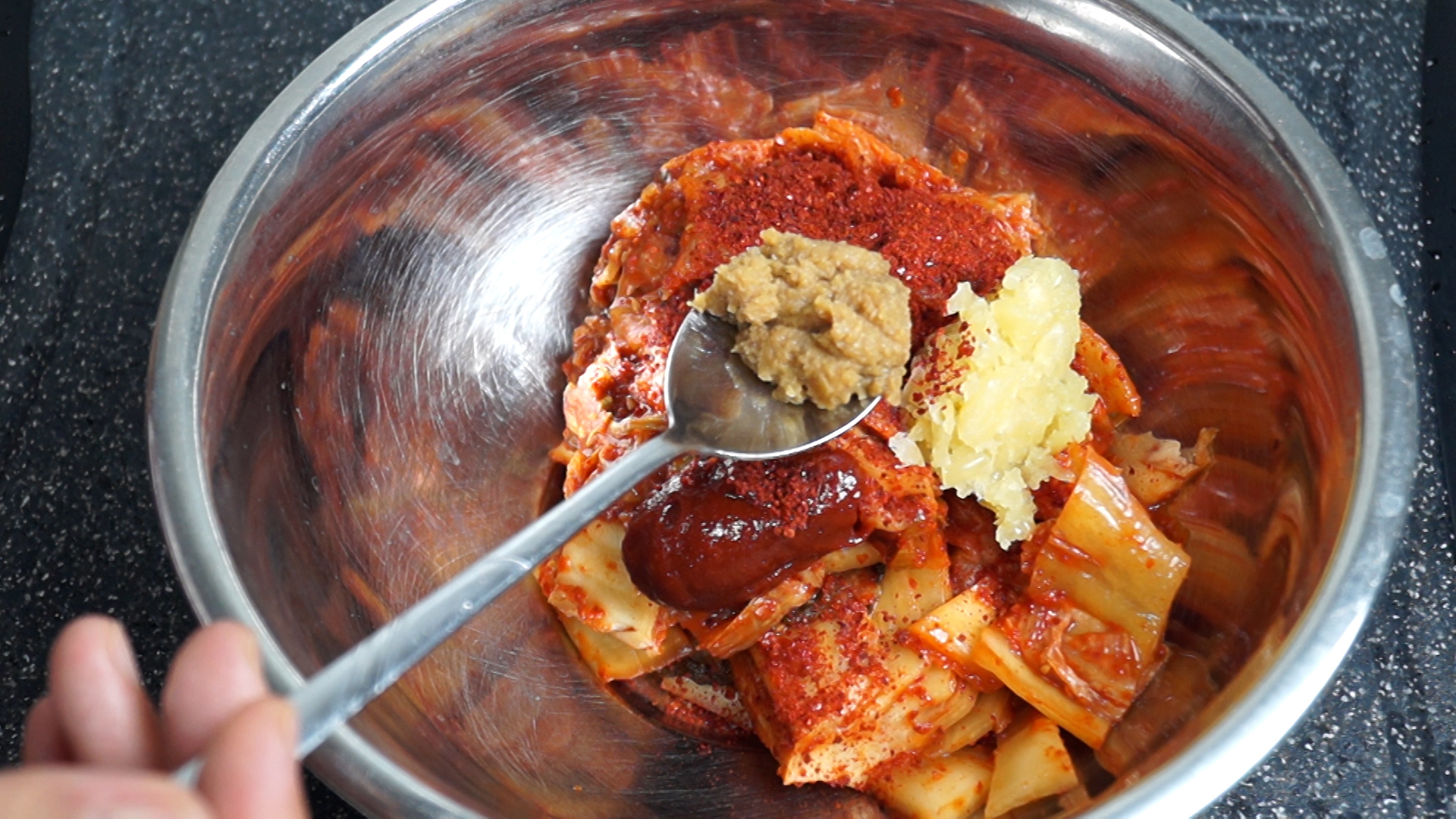 3. 볼에 김치를 넣고 양념란에 표기된 재료를 전부 넣어주세요. 고춧가루는 중간입자 고춧가루입니다.