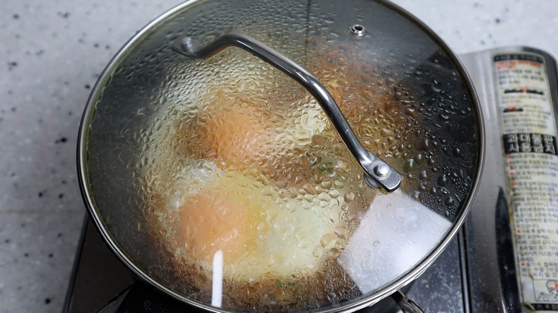 12. 13. 뚜껑을 덮은 다음 40초 정도를 자글자글 끓일거에요. 강불로 계속하는게 부담스러울땐 중불로 하셔서 계란은 1분 20초 정도 중불에 튀기고 양념 넣고 뚜껑덮고 1분 20~30초 정도 쪄주세요.