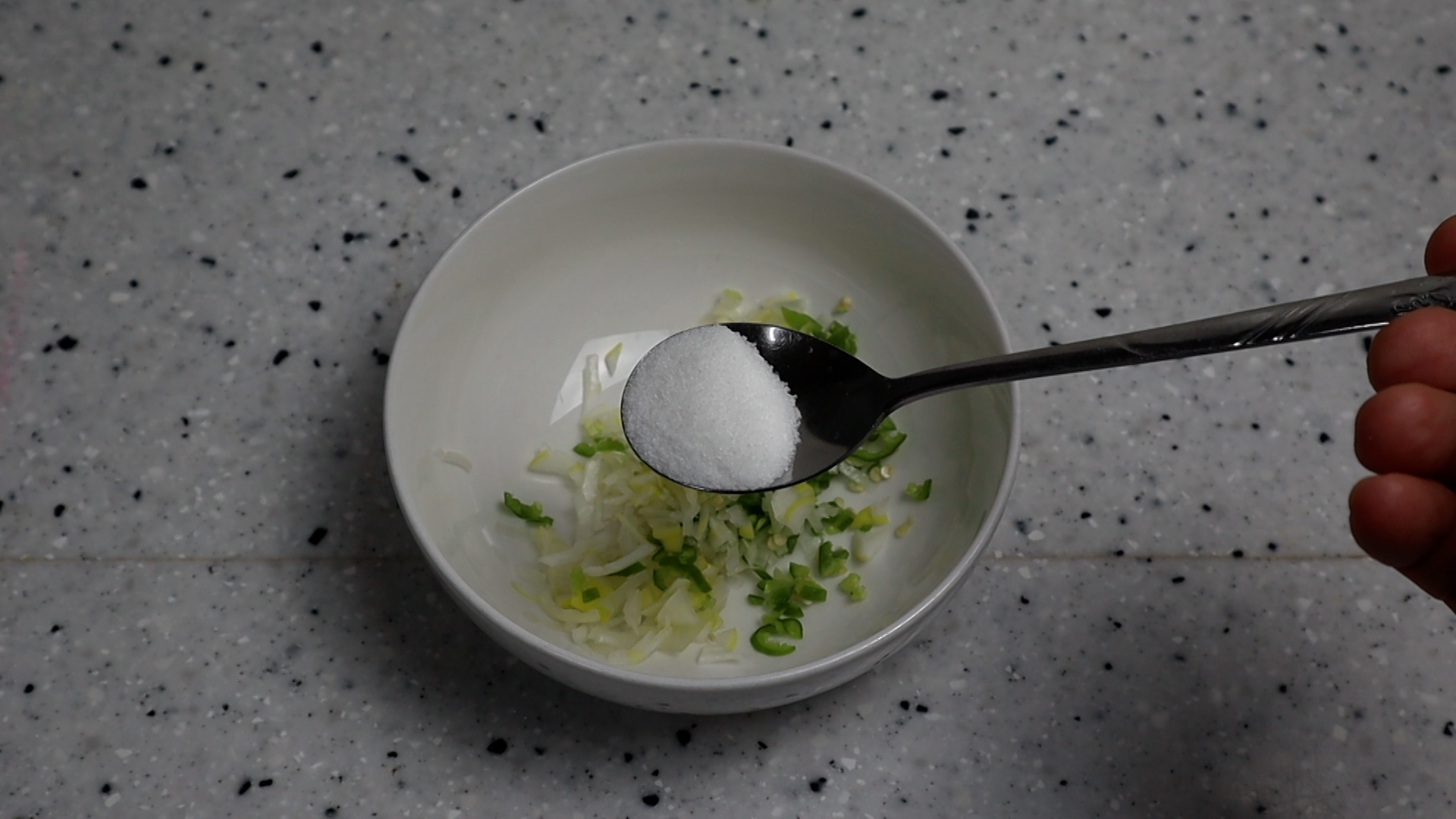 3. 볼에 대파 와 땡초(팽이버섯)을 넣고 양념 재료를 넣어주세요. 설탕은 깍아서 반스푼 입니다.