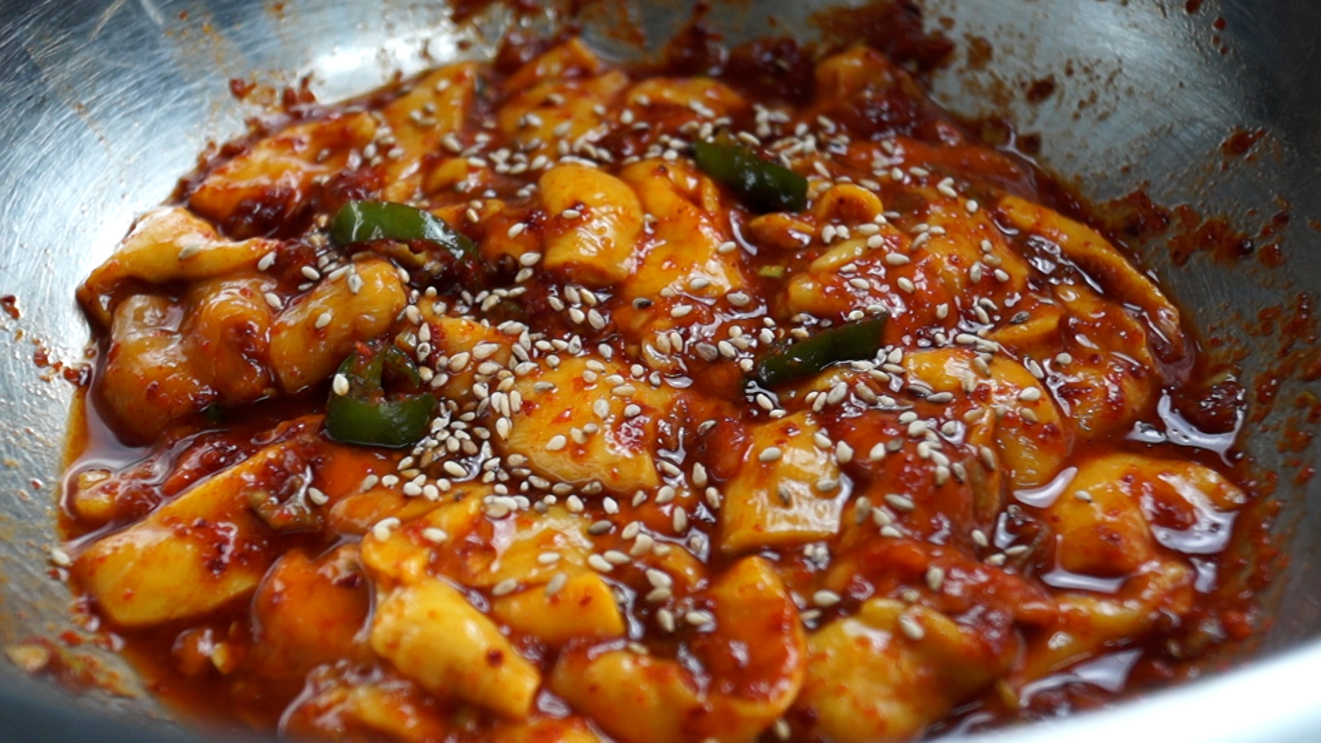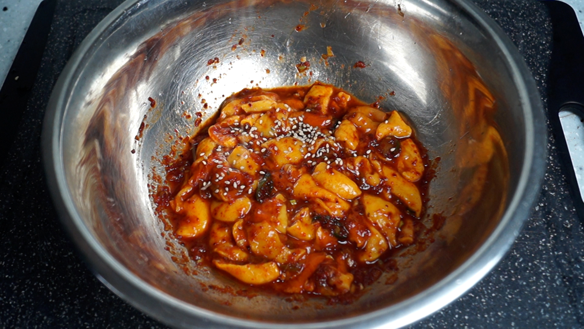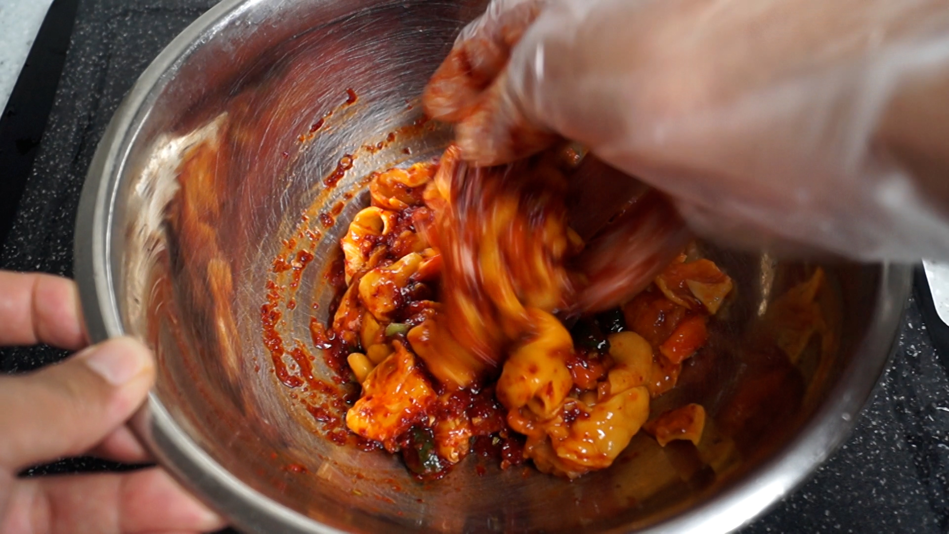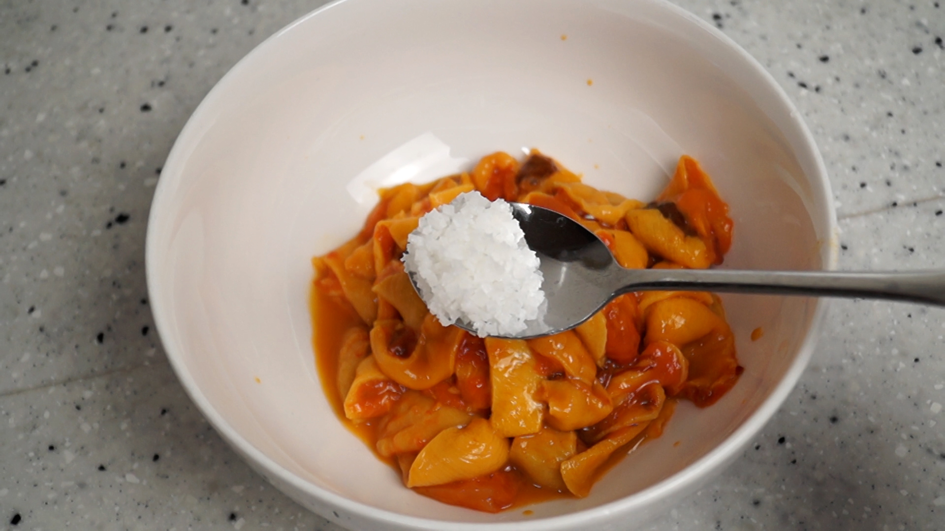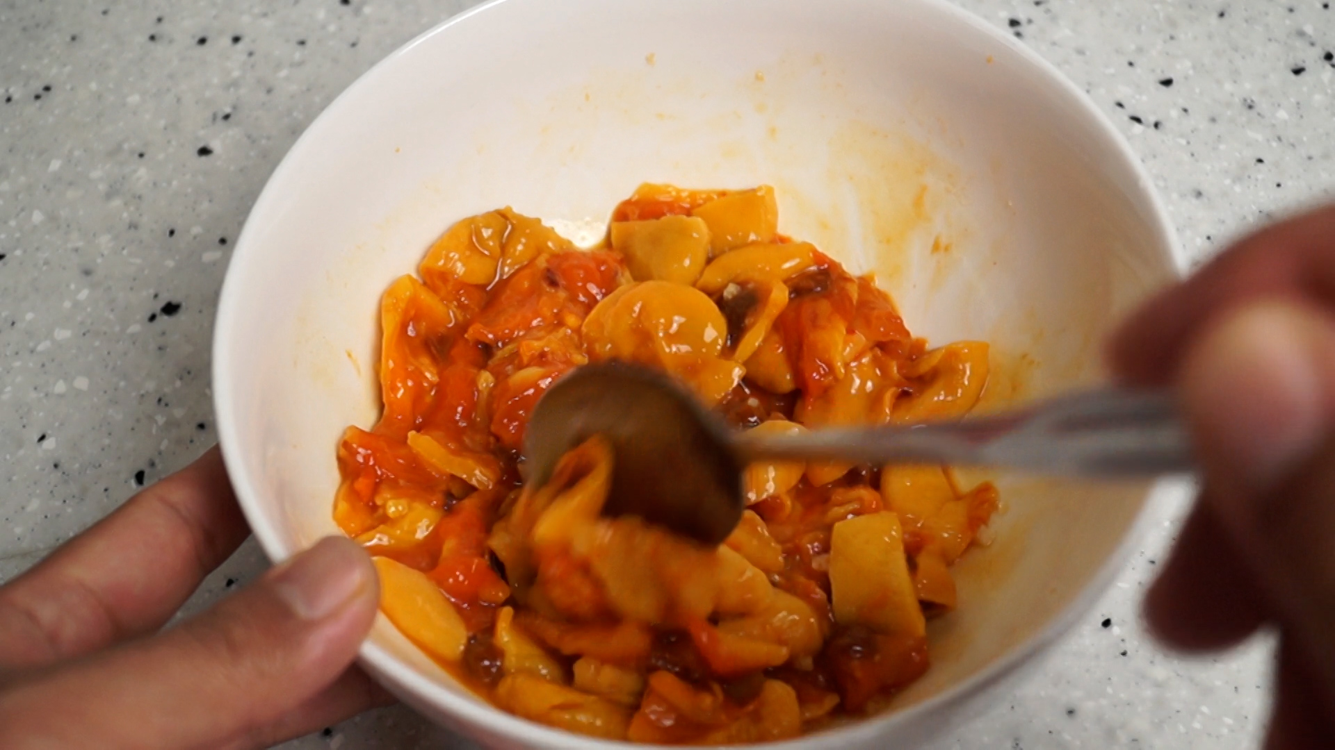 19. 물기뺀 멍게에 양념을 전부 넣고 골고루 버무려주세요.