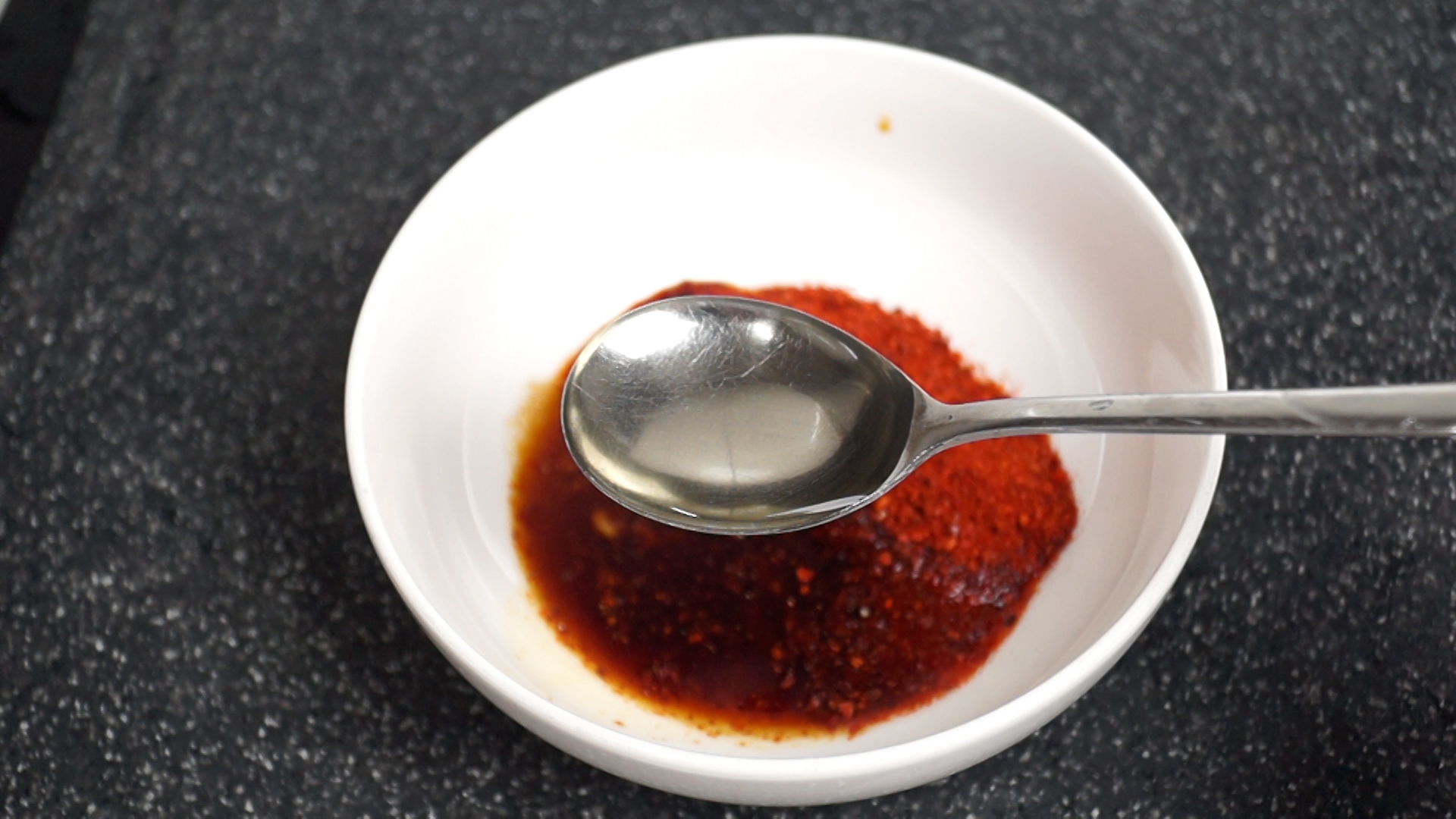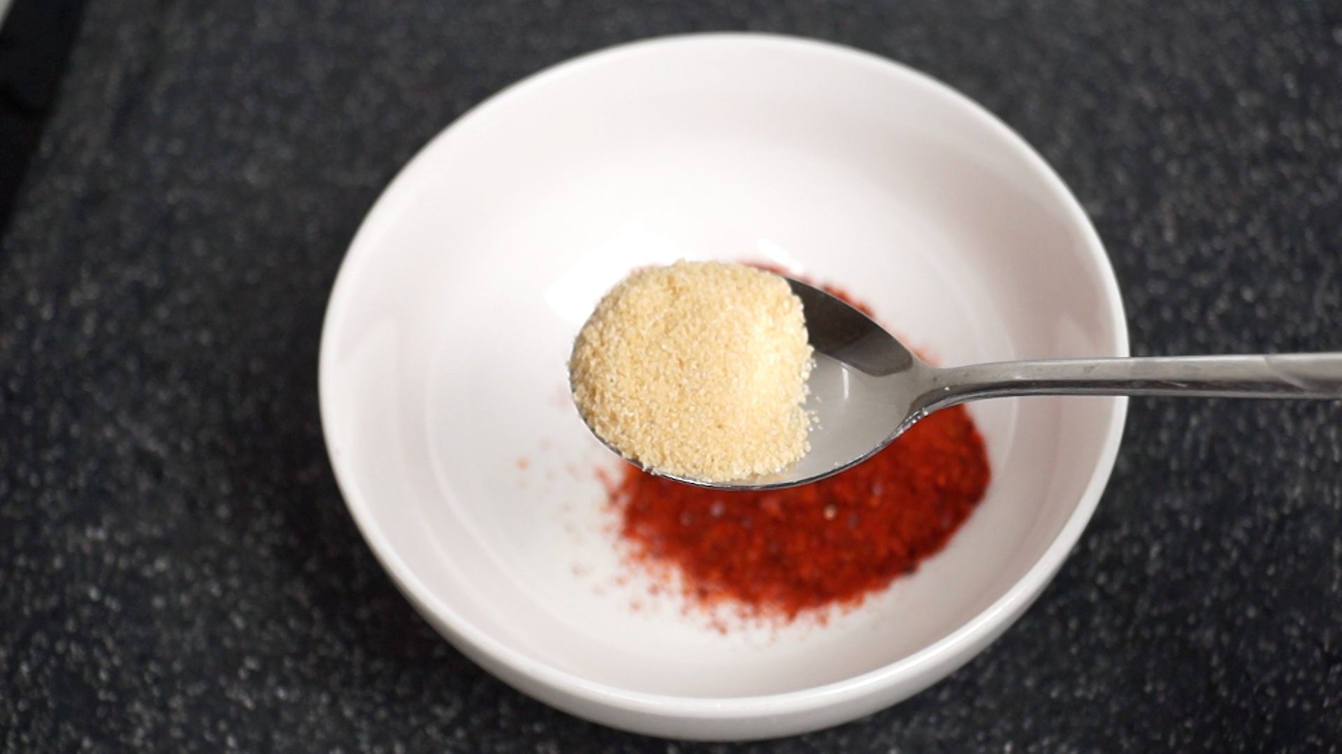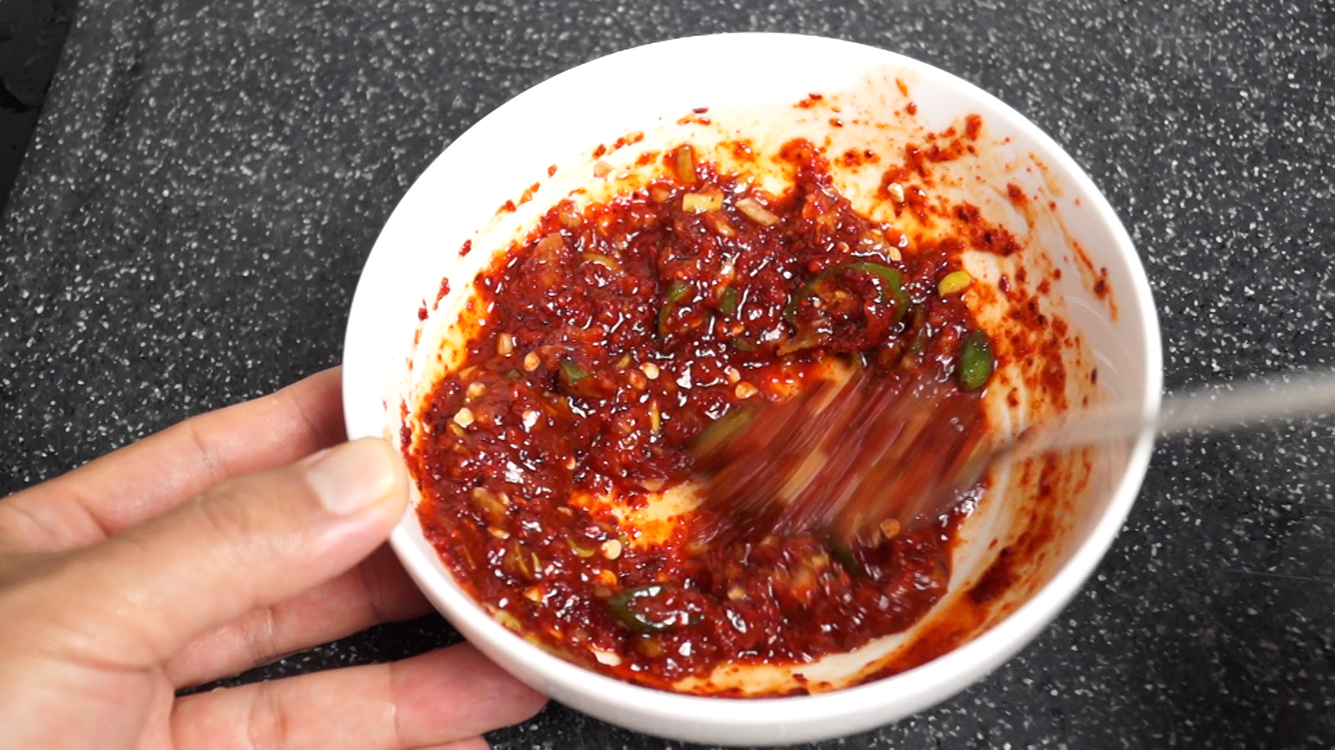 6. 양념란에 적힌 재료를 한데 넣어주세요. 고춧가루는 중간입자 고춧가루입니다.