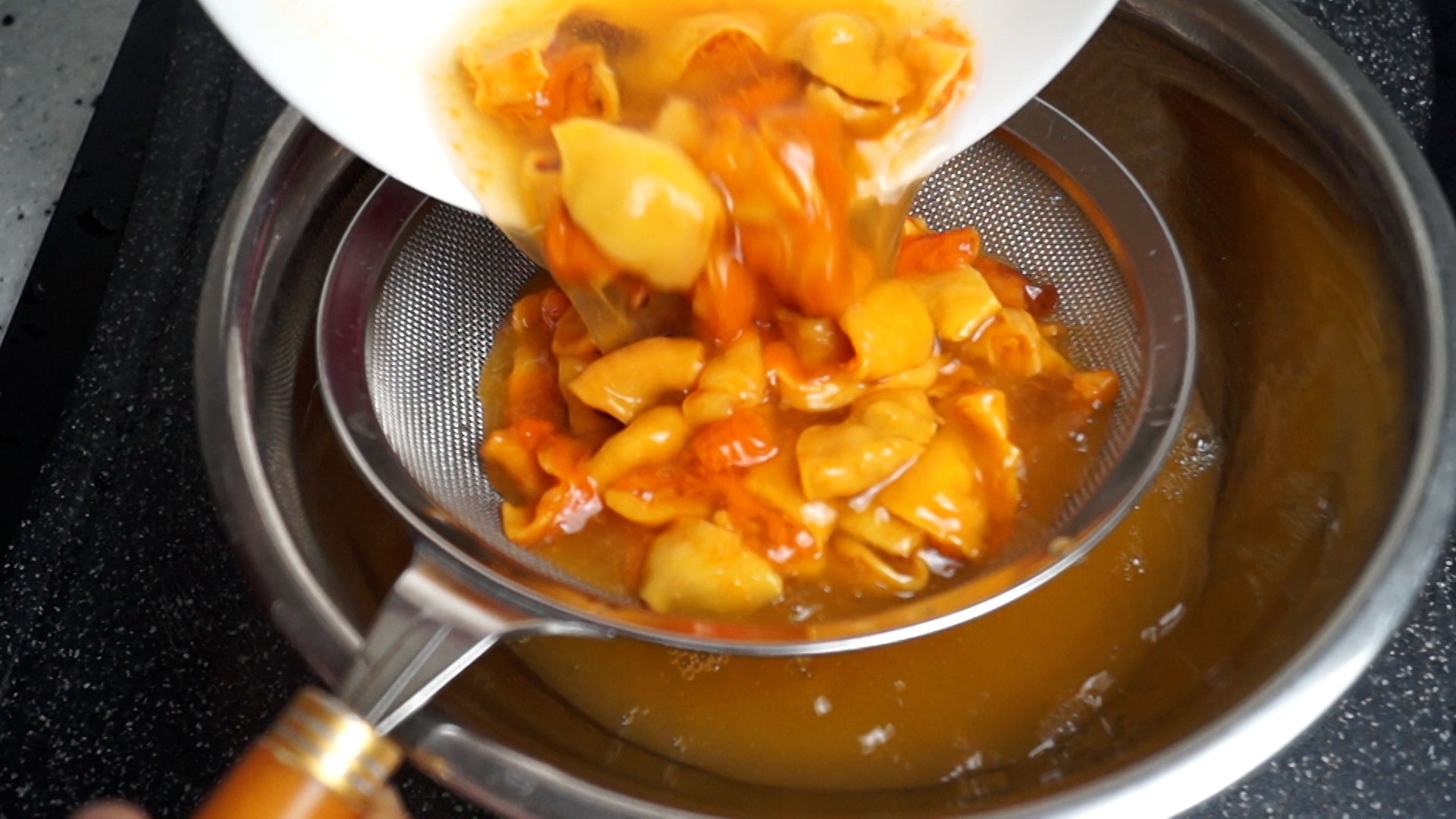 18. 채반에 부어서 냉장실에 넣고 1시간 정도 물기를 빼주세요.