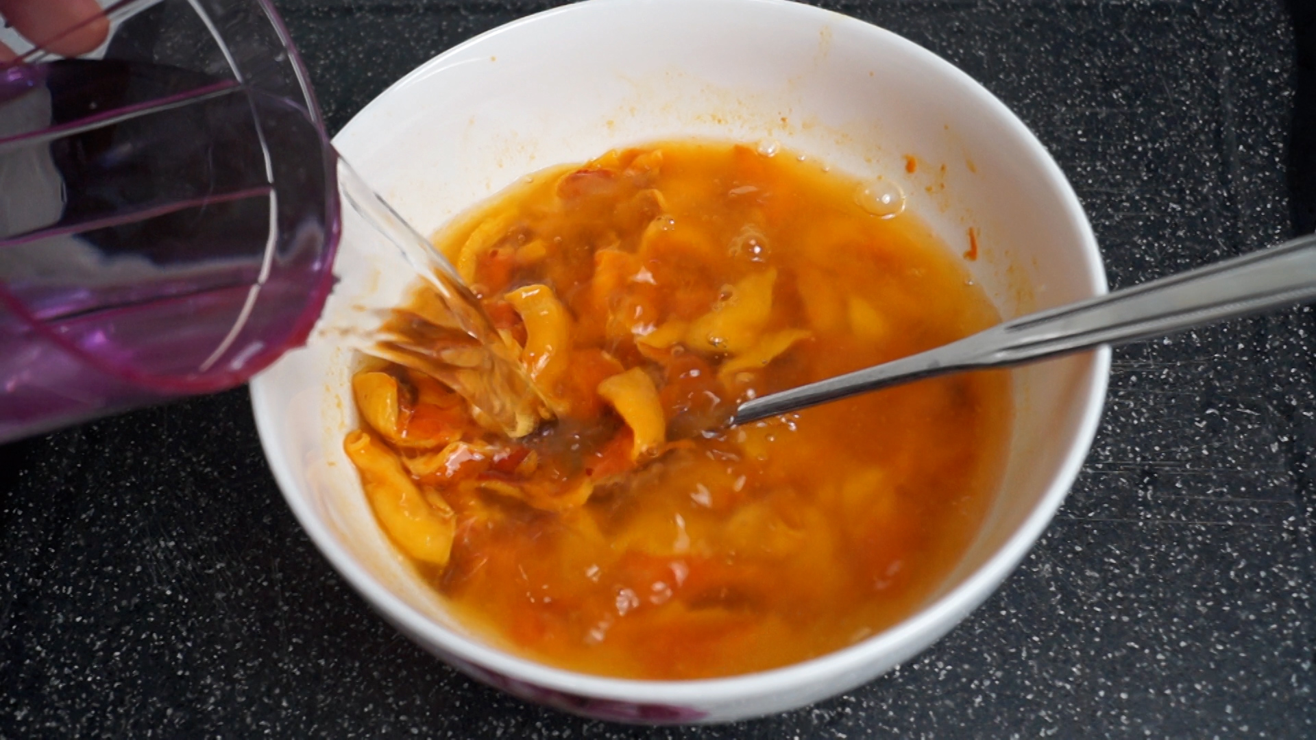 17. 절인 멍게에 찬물을 넉넉하게 부어서 한번 헹궈 짠맛을 빼주세요.
