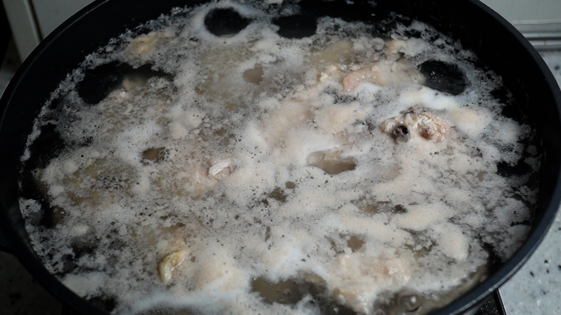 1. 물 2~3리터를 팔팔 끓여서 절단닭을 넣고 물이 다시 끓어오르면 초벌로 5분을 삶아줍니다.