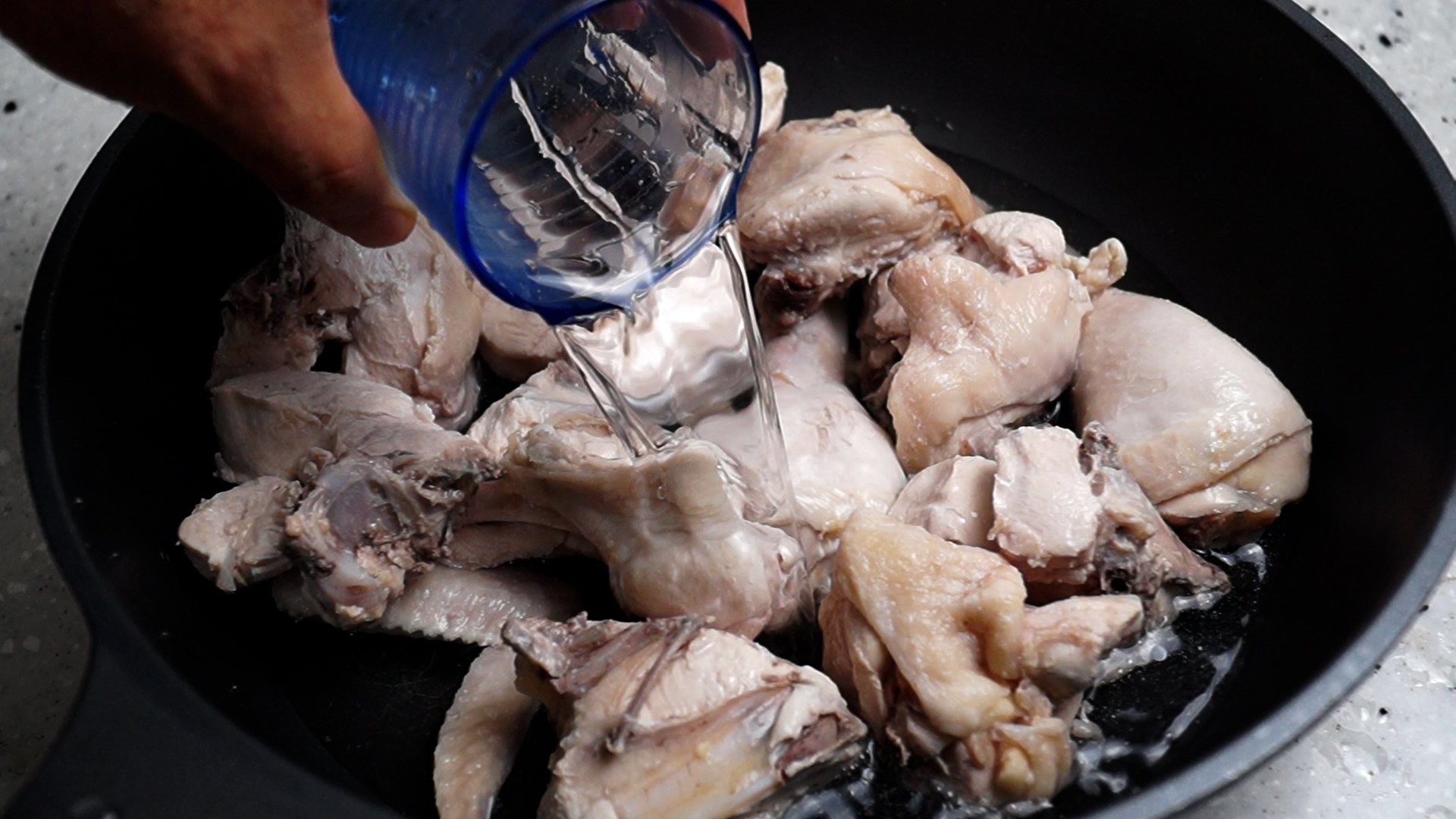 9. 냄비에 닭을 넣고 물 800cc 를 부어주세요.