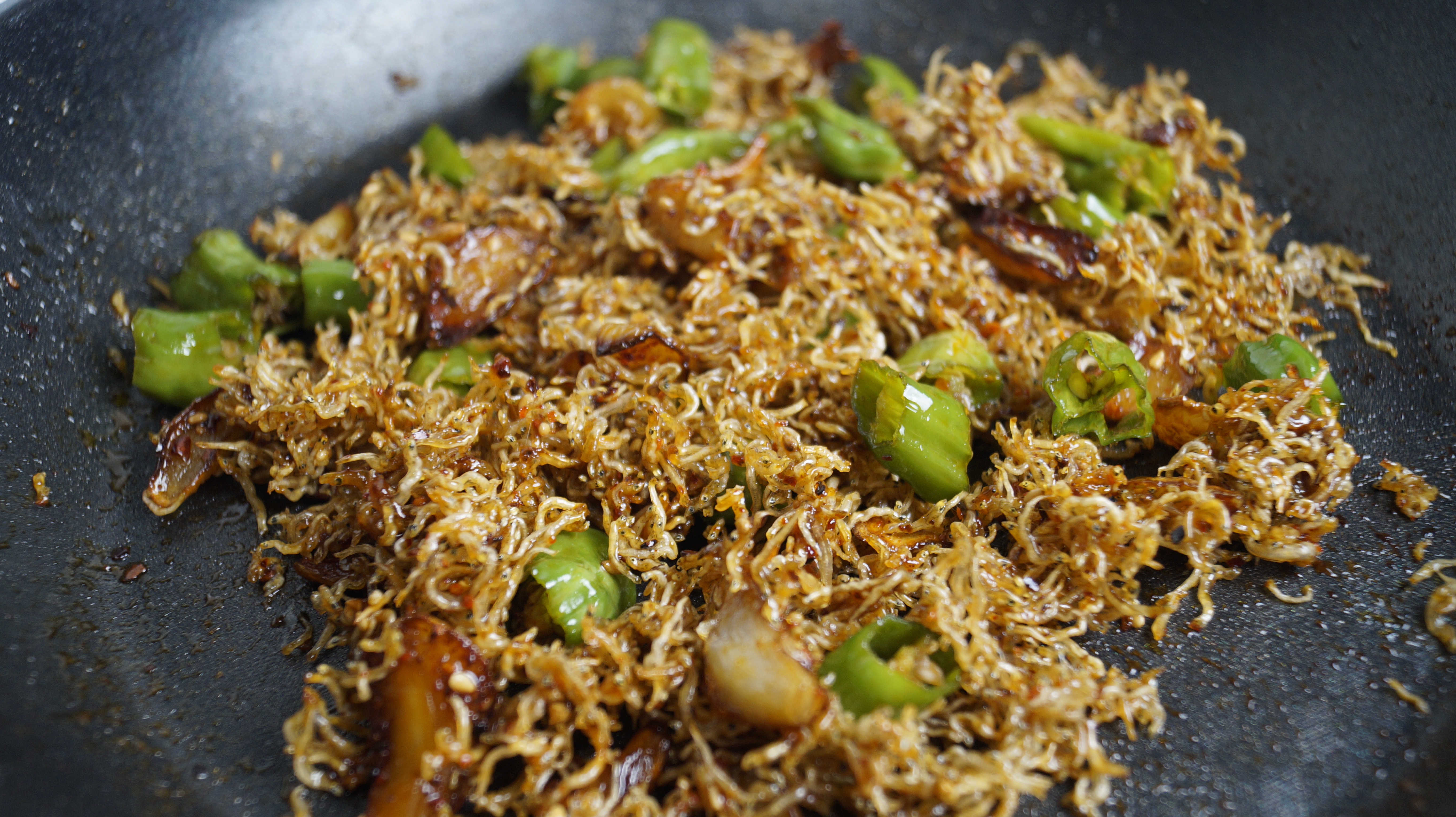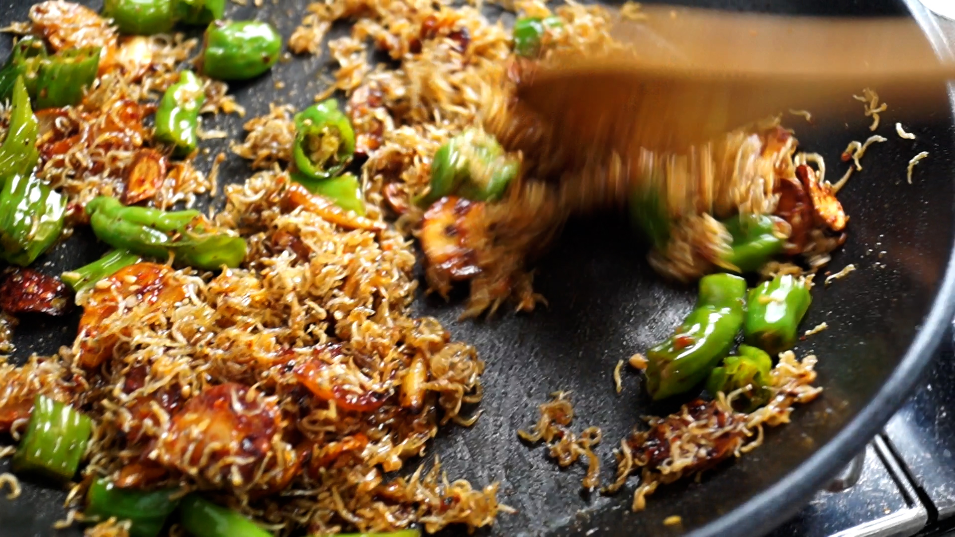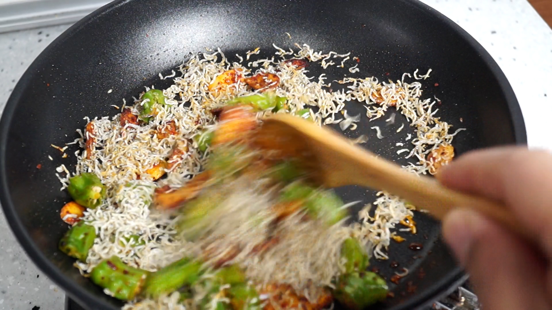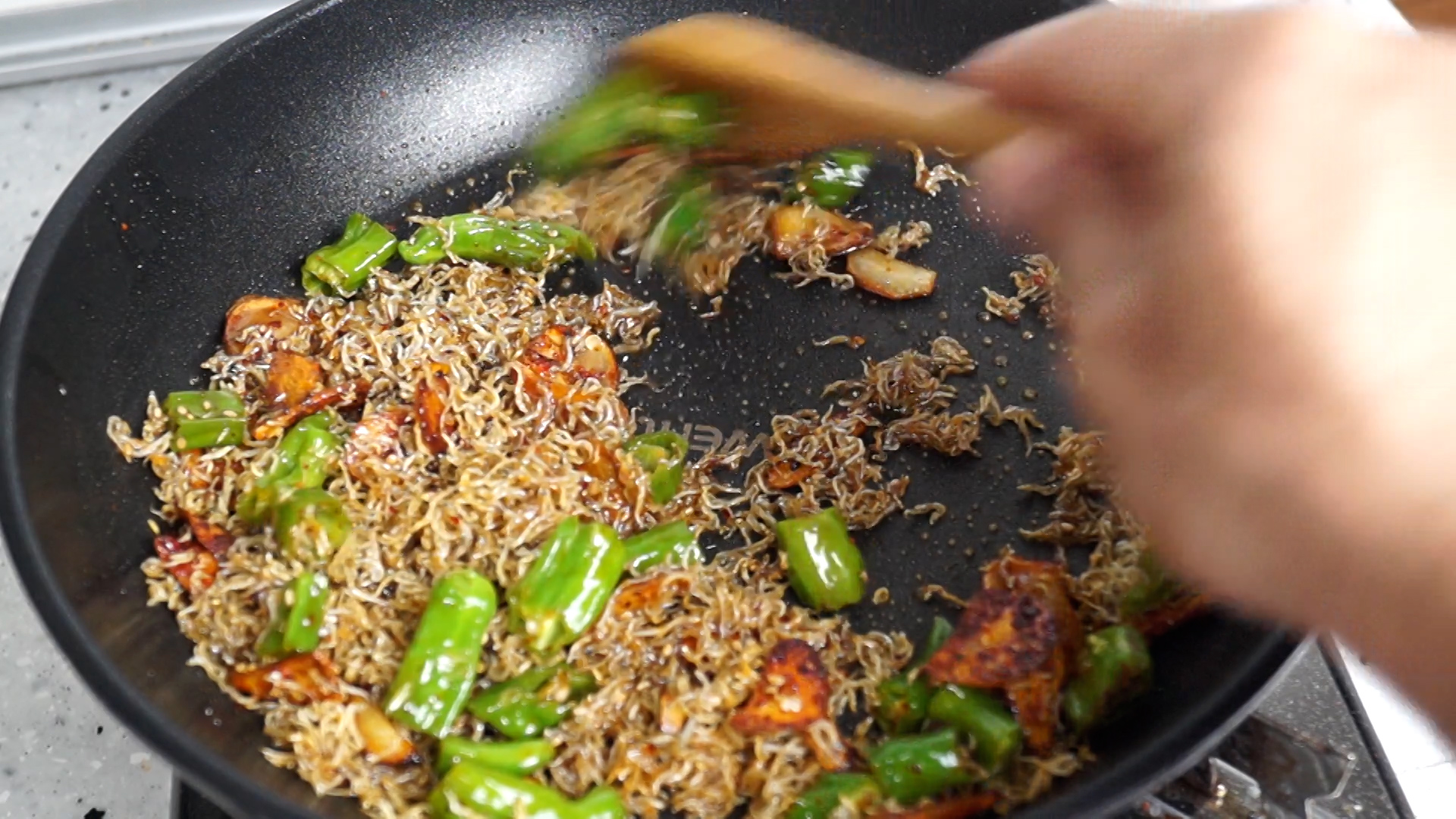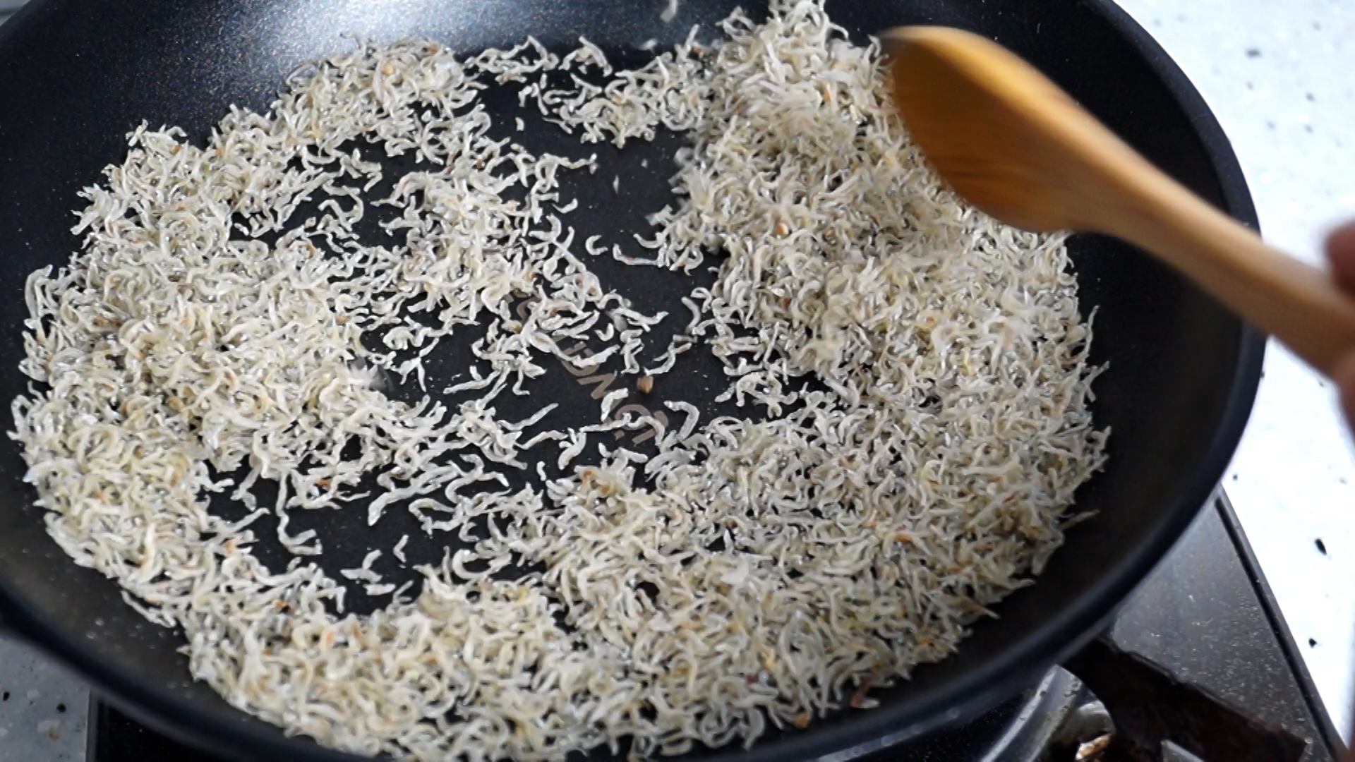 13. 잔멸치를 넣고 중불에 30~40초간 볶아주세요.