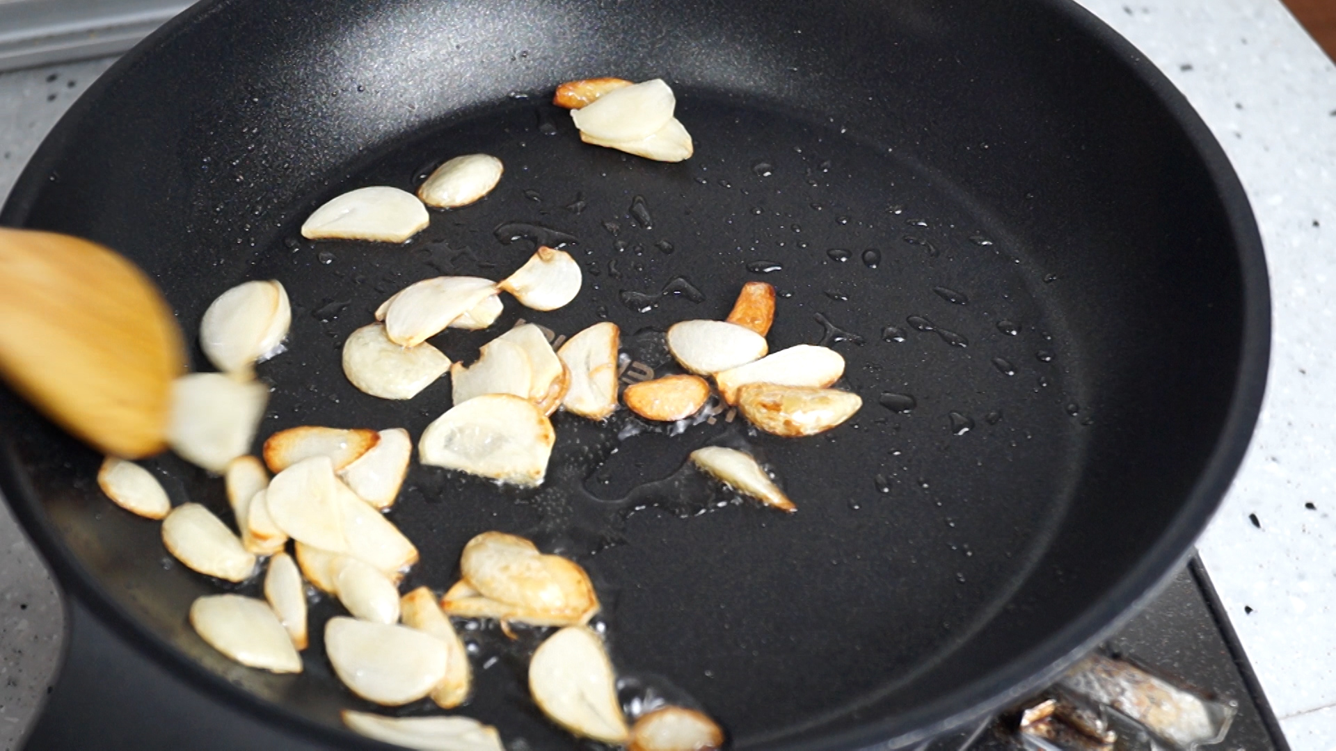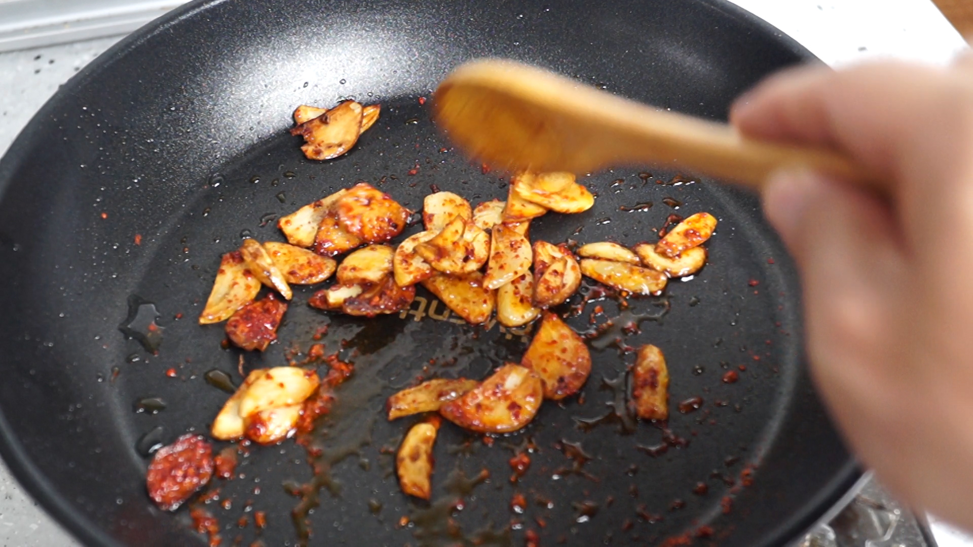10.팬에 식용유를 붓고 마늘을 넣고 약불에 2~3분 볶아서 노릇노릇하게 구워주세요.