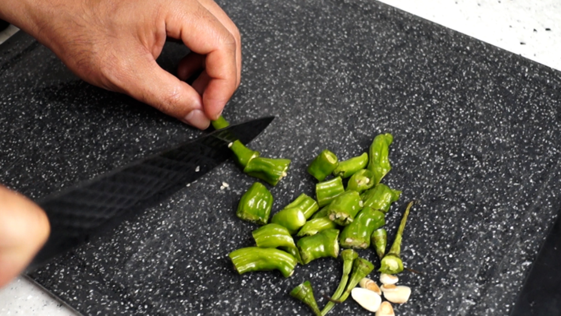 3. 꽈리고추 6개를 씻어서 4~5등분으로 잘라주세요. 기호에 따라 꽈리고추 대신 땡초를 동량 준비하셔도 좋아요.