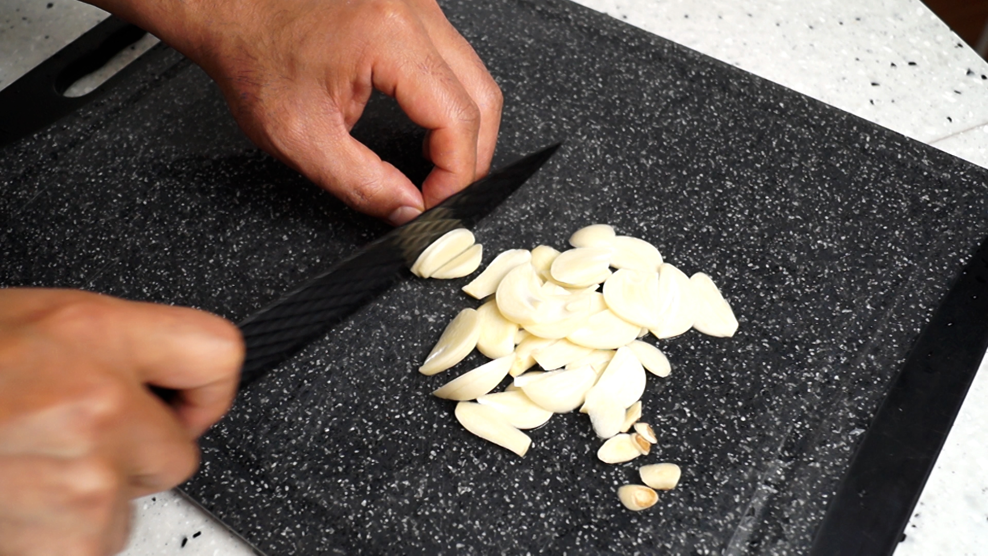 2. 통마늘 6알을 2~3mm 정도로 얇게 편으로 썰어주세요.