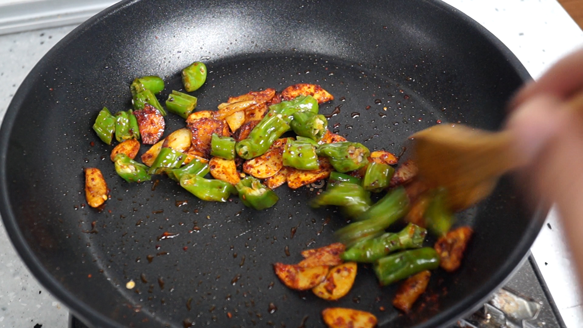12. 꽈리고추를 넣고 중불에 30~40초 볶아주세요.