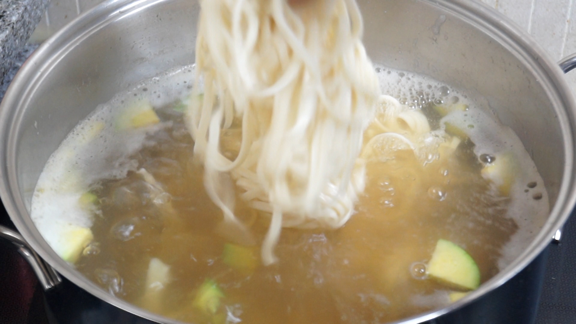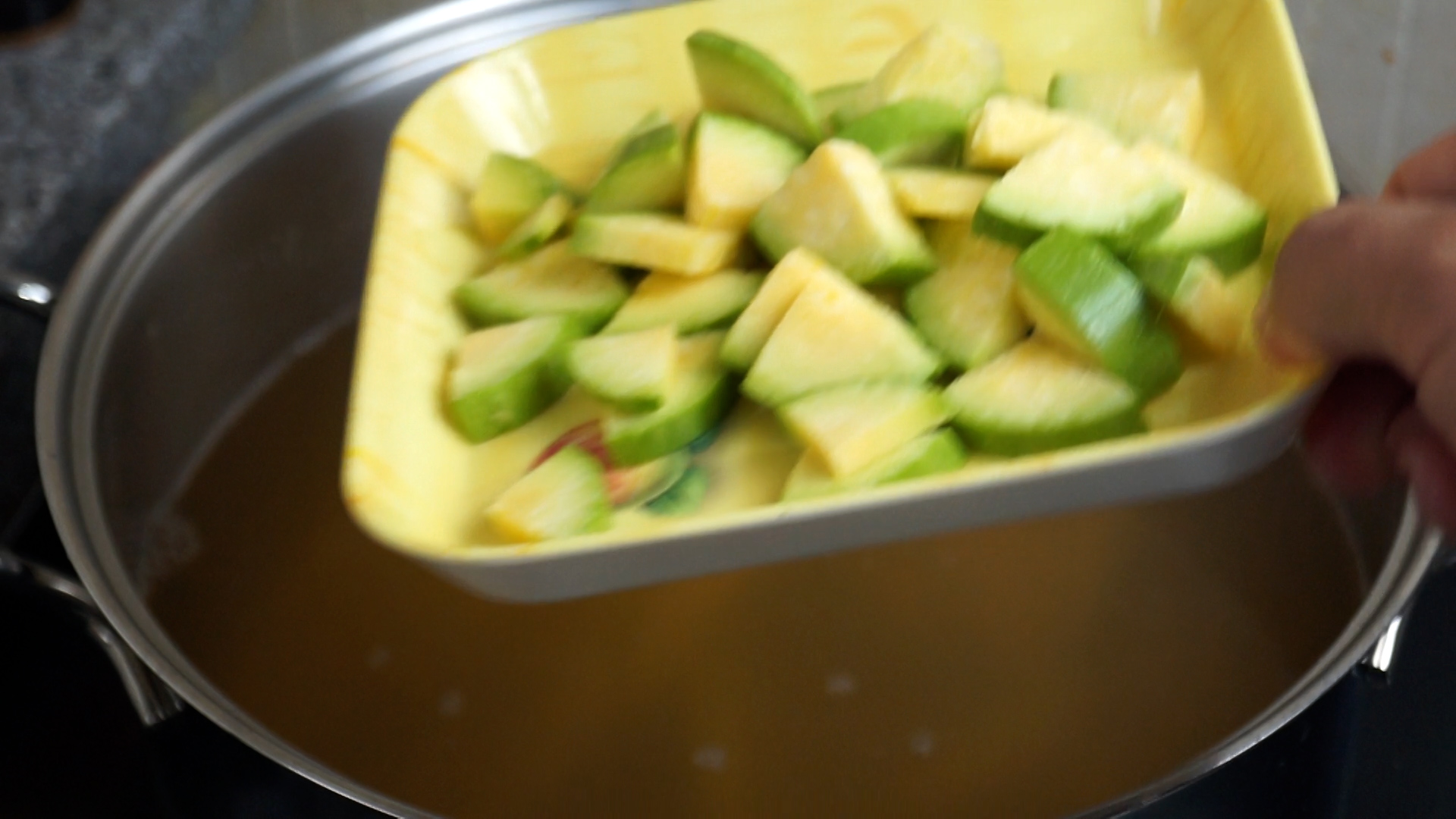 14. 애호박 반개를 두께는 1cm 크기는 기호에 따라 썰어 넣어주세요. 호박식감을 좀 더 살리려면 완성 1분 전에 넣어주세요.