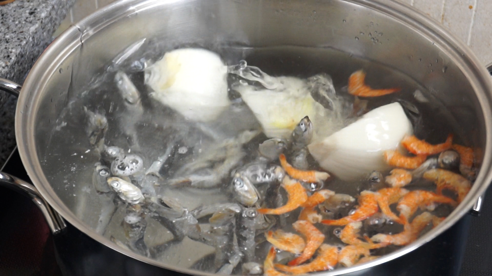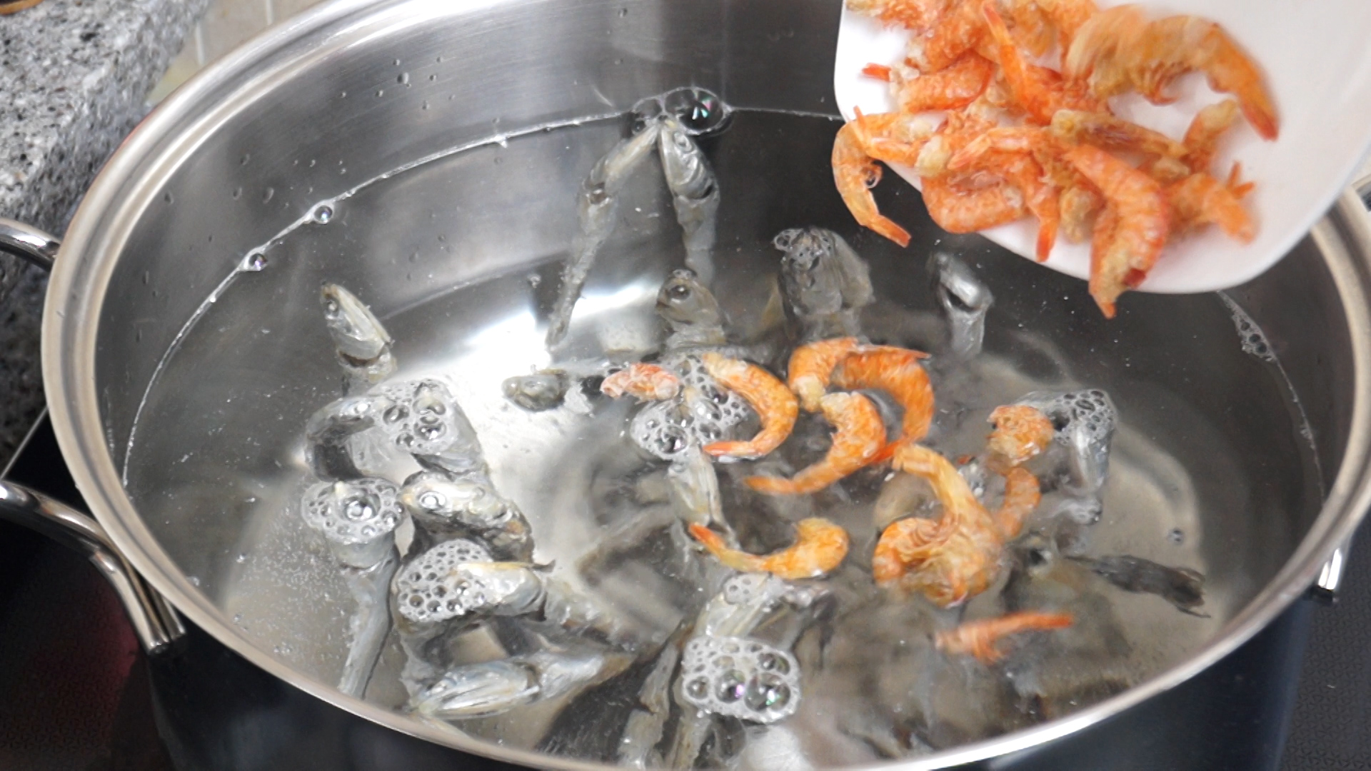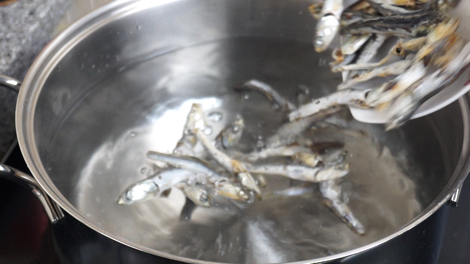 2. 냄비에 물 3리터를 붓고 대멸 40마리를 넣어주세요. 짧게 끓이는 방식이라 똥은 따로 안떼어냈는데 기호에 따라 떼어 주셔도 됩니다.