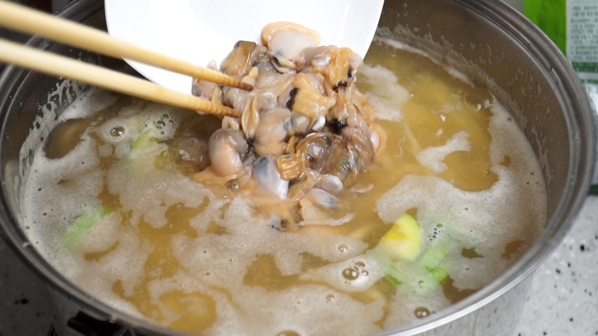17. 추가간을 맞춘 다음 바지락을 넣고 1분 마저 끓여주세요.