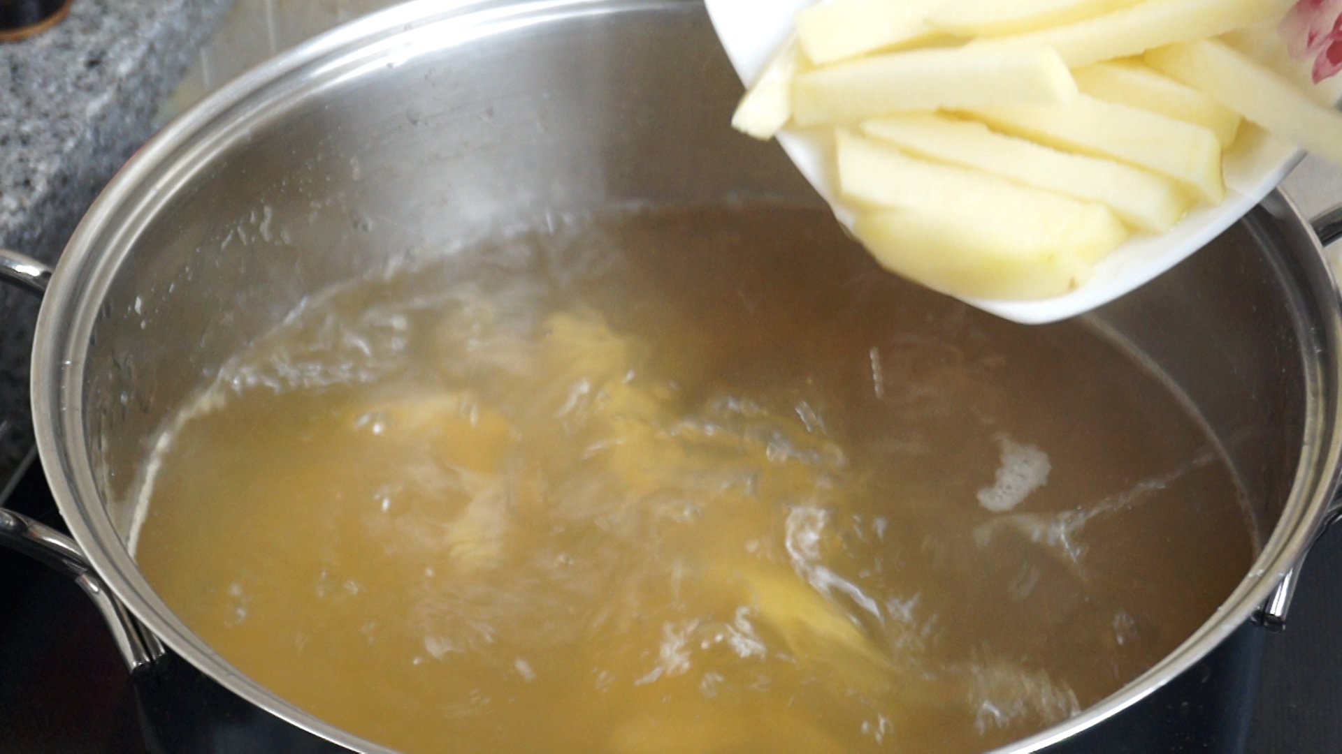13. 감자 1개 200g 을 1cm 이하 두께로 길게 썰어넣어주세요. 너무 두껍게 썰면 감자가 안익을수도 있습니다.