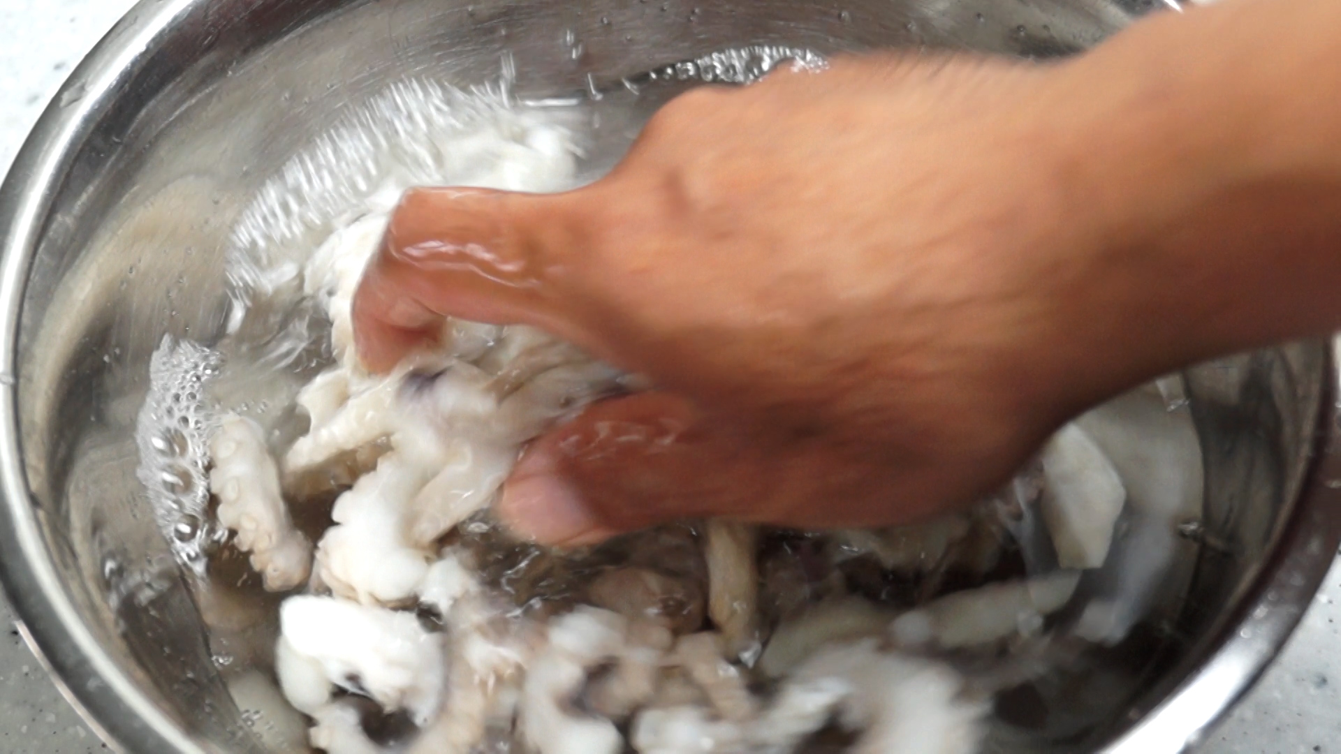 18. 밀가루에 치대 놓은 낙지를 2~3차례 찬물에 깨끗이 씻어서 물기를 빼 놓아주세요.