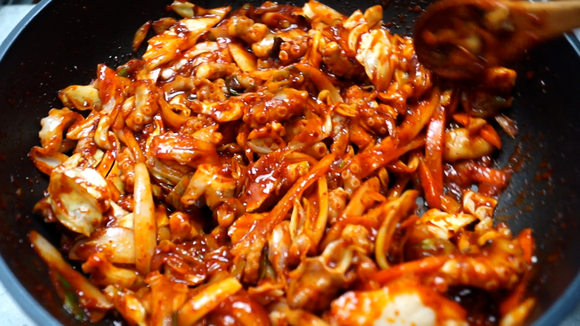 21. 낙지를 넣고 2분 정도 강불에 강하게 볶아주세요. 당면을 넣고 싶으시면 건당면 30~40g을 미리 불려놨다가 양념 넣을 때 넣으시면 됩니다.