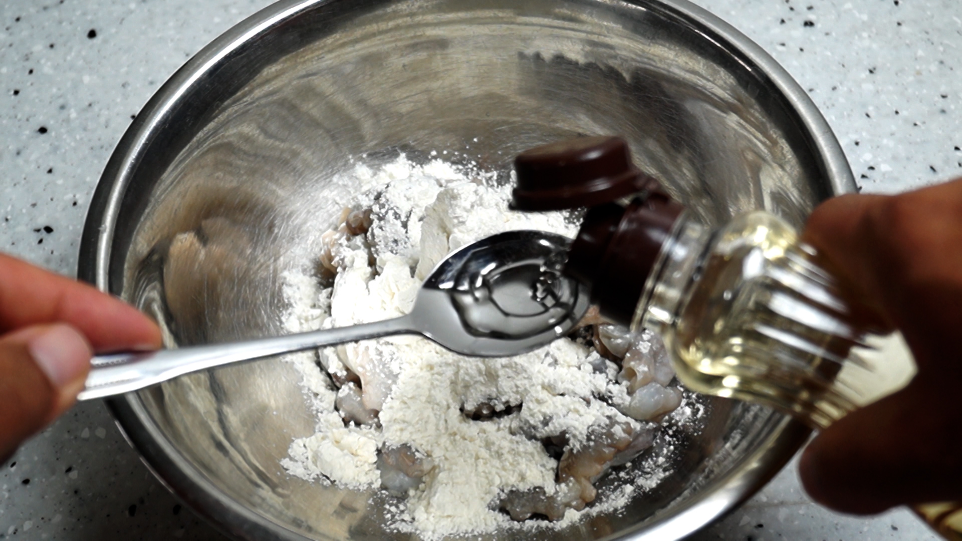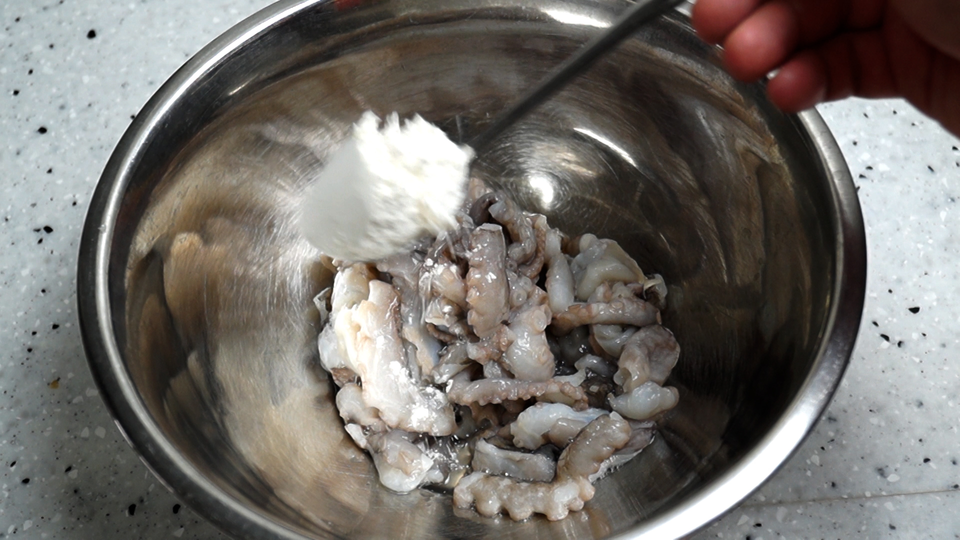 11. 손질된 냉동낙지에 밀가루를 뿌려주세요. 생낙지 사용 시 내장과 입, 눈을 제거한 다음 먹기 좋게 잘라 넣어주세요. 전 개인적으로는 손질된 냉동낙지가 사용이 편해서 애용하는 편입니다.