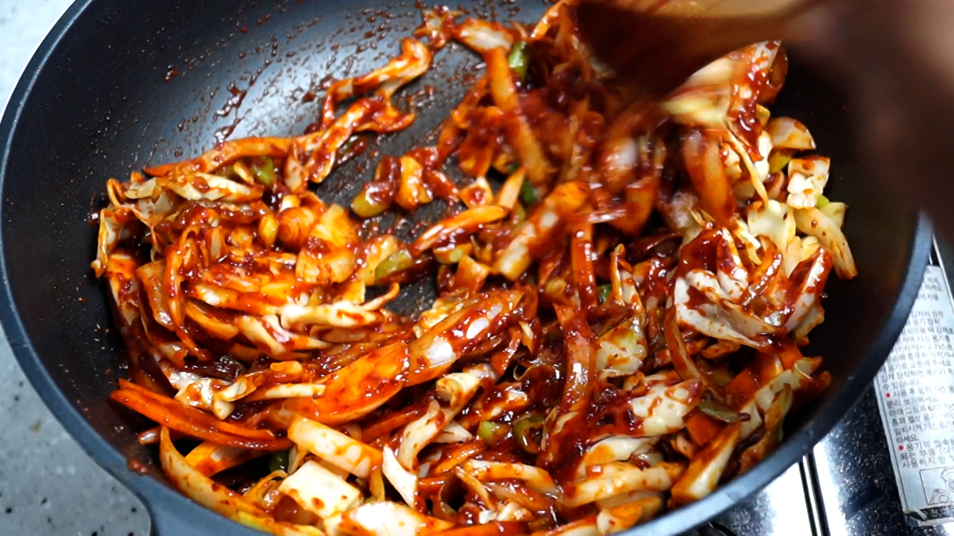 20. 양념을 넣고 강불 그대로 유지하고 1~2분간 더 볶아주세요.
