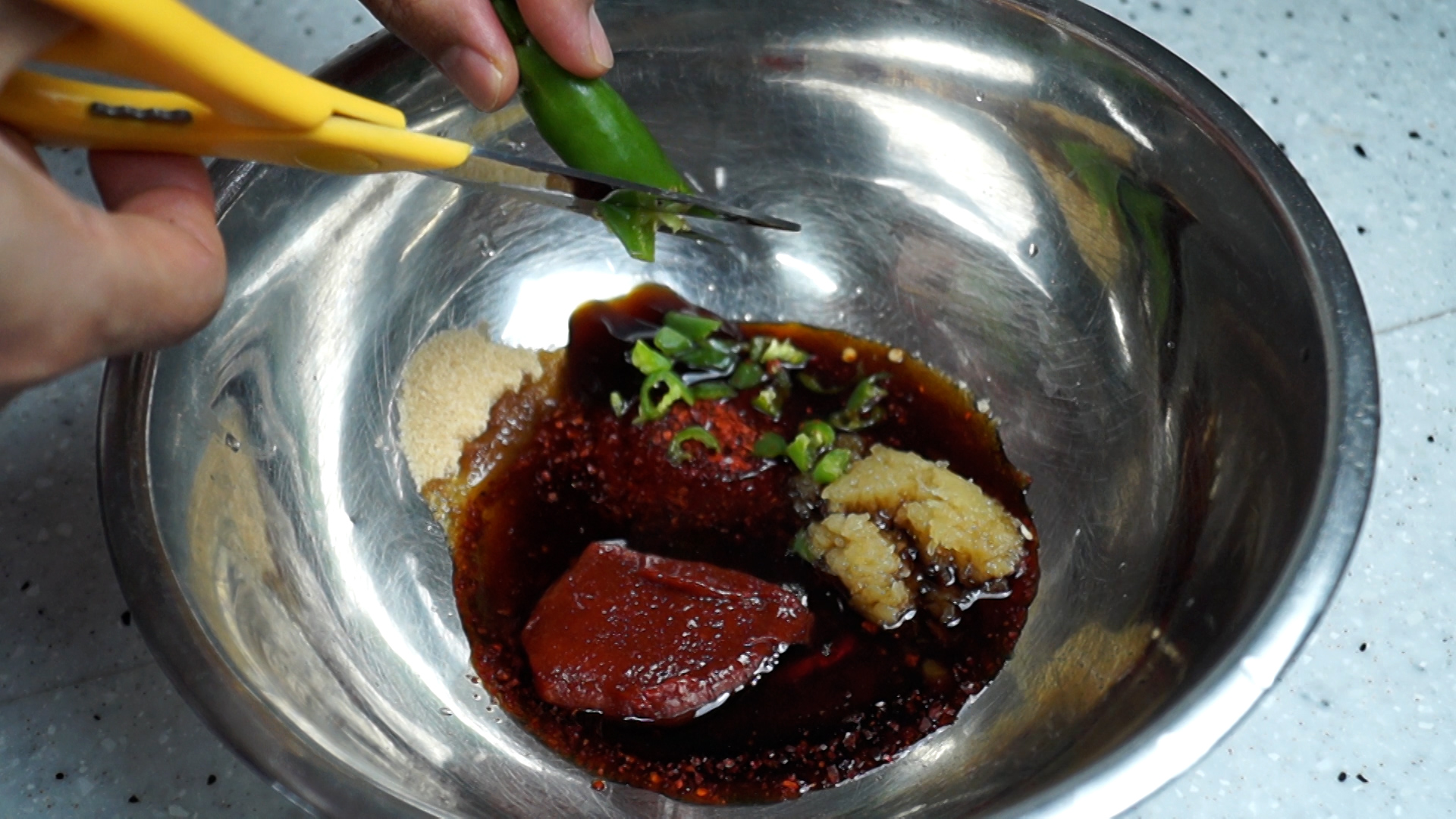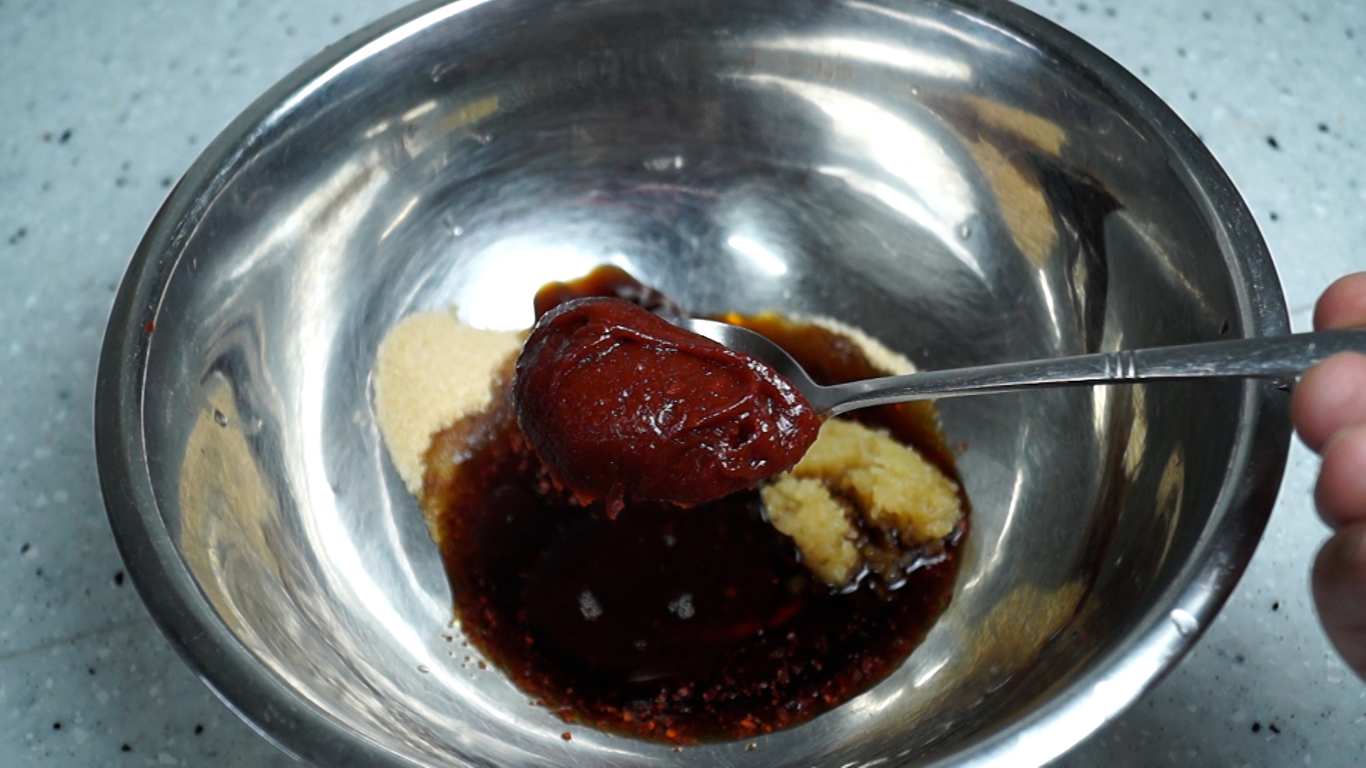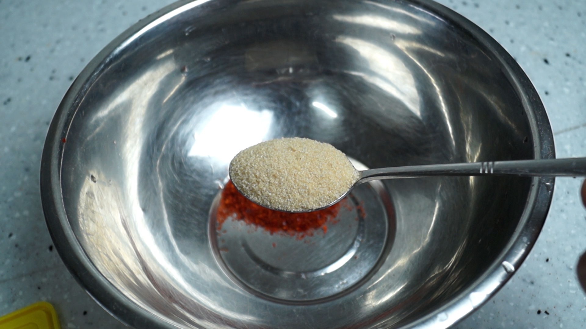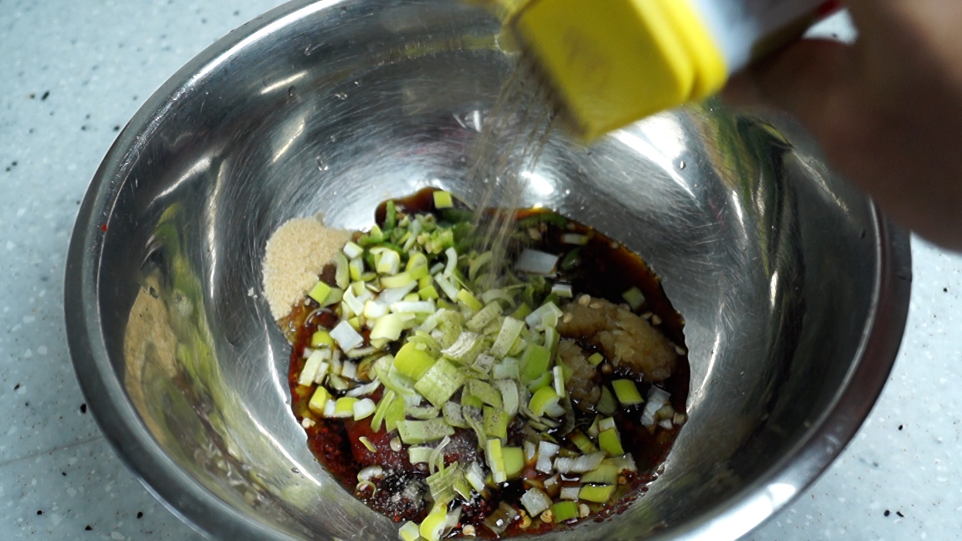 2. 양념란에 적힌 재료를 한데 넣어주세요. 고춧가루는 중간입자 고춧가루입니다.