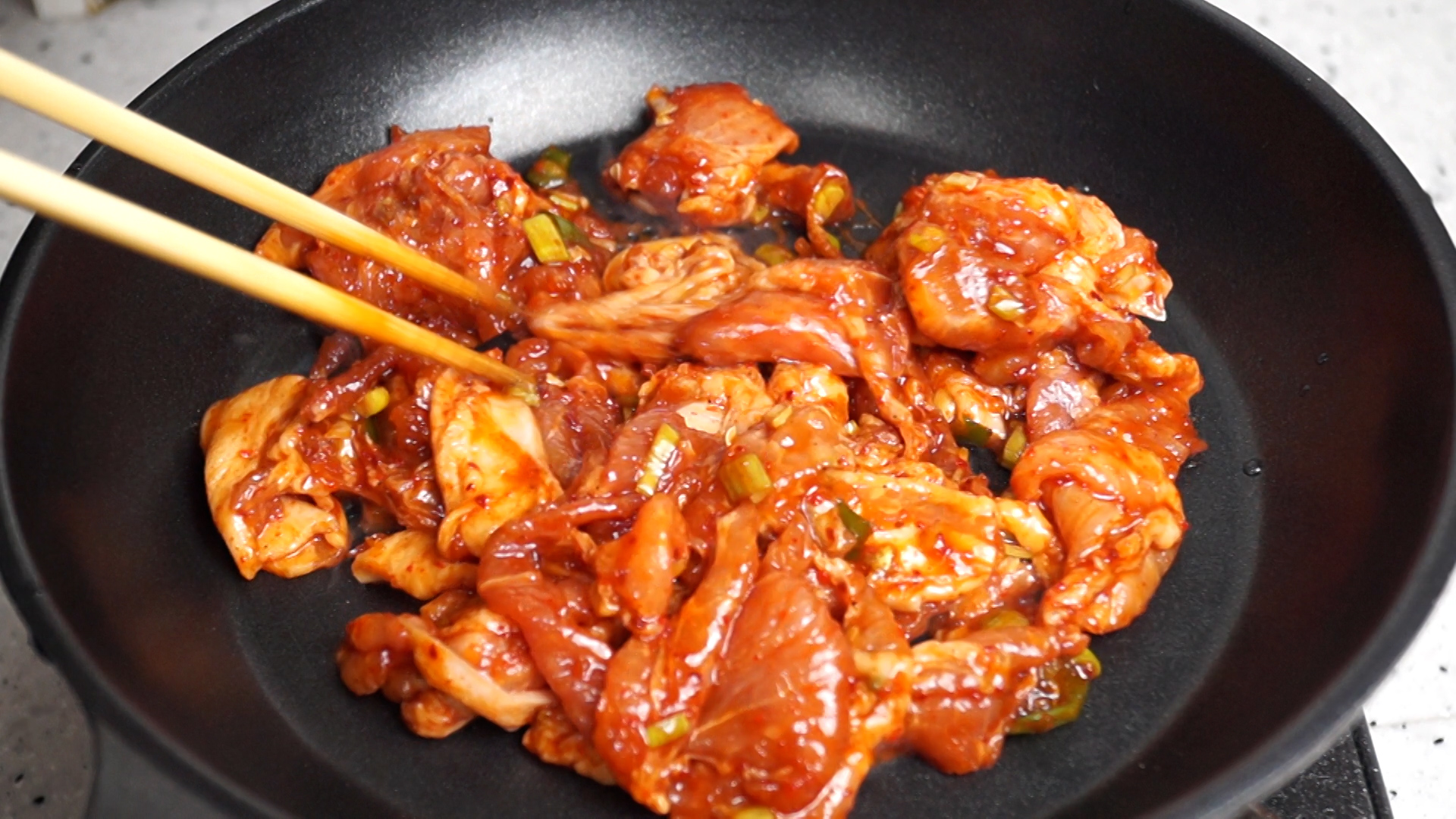 17. 2~3분 볶아서 고기가 80% 이상 익었을때 양파를 넣고 1~2분간 더 볶아서 고기를 완전히 익혀주세요.