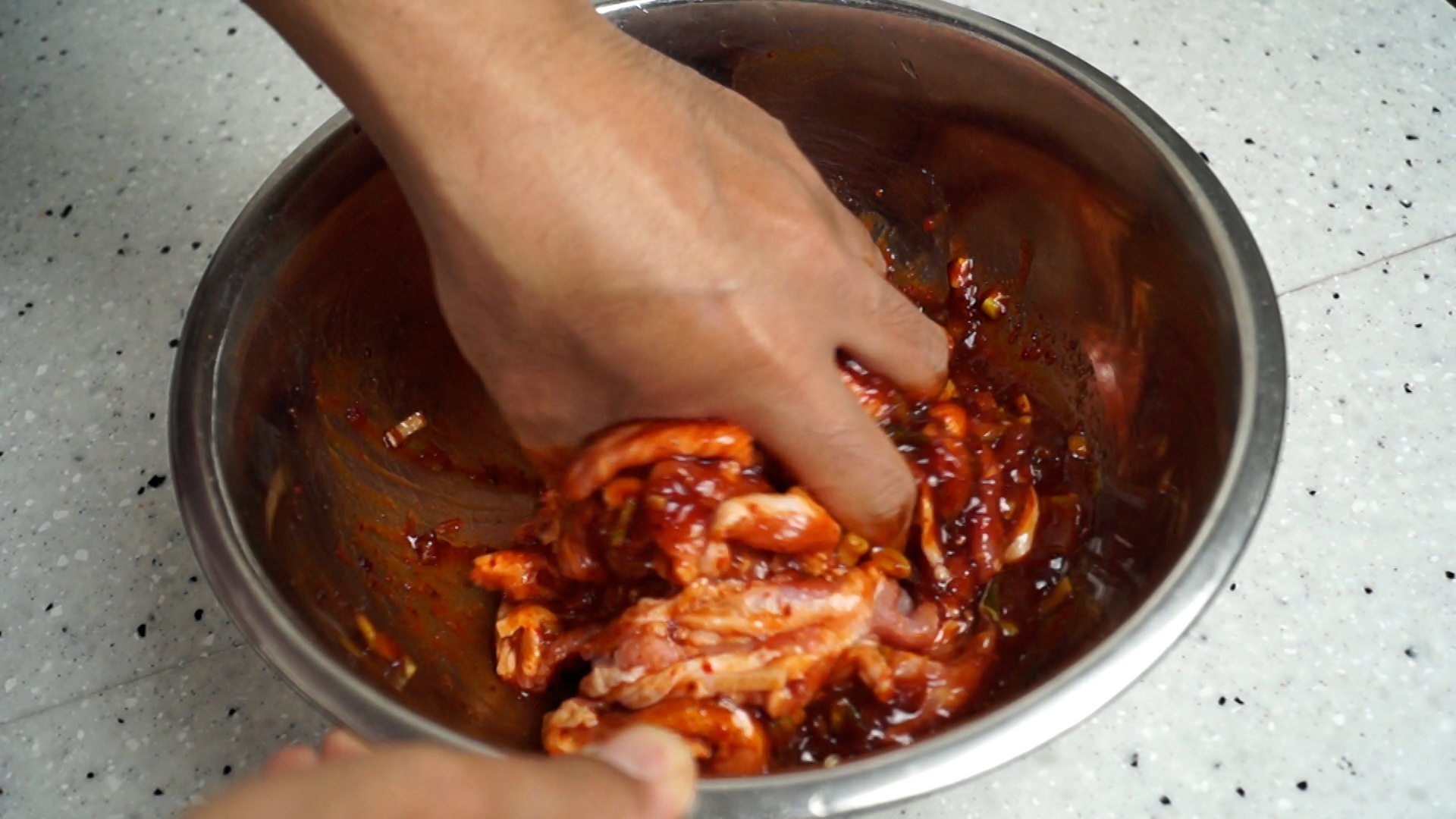 15. 제육용 앞다리살을 2mm 정도로 얇게 나온걸 넣고 골고루 치대서 20분 정도 가만히 두세요. 평소 간을 좀 약하게 드시는 분들은 700g 까지 넣으셔도 됩니다.